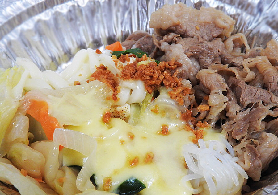 「チーズ尽くしのガーリックトマト牛鍋定食」と同じ手順で作って完成しました。たまごなしの状態で食べてみると、味が濃い!割下は濃厚で甘めの味付けでしたね。時折感じるさらし葱と生姜の苦みで味の変化があり、飽きることなく食べられます。