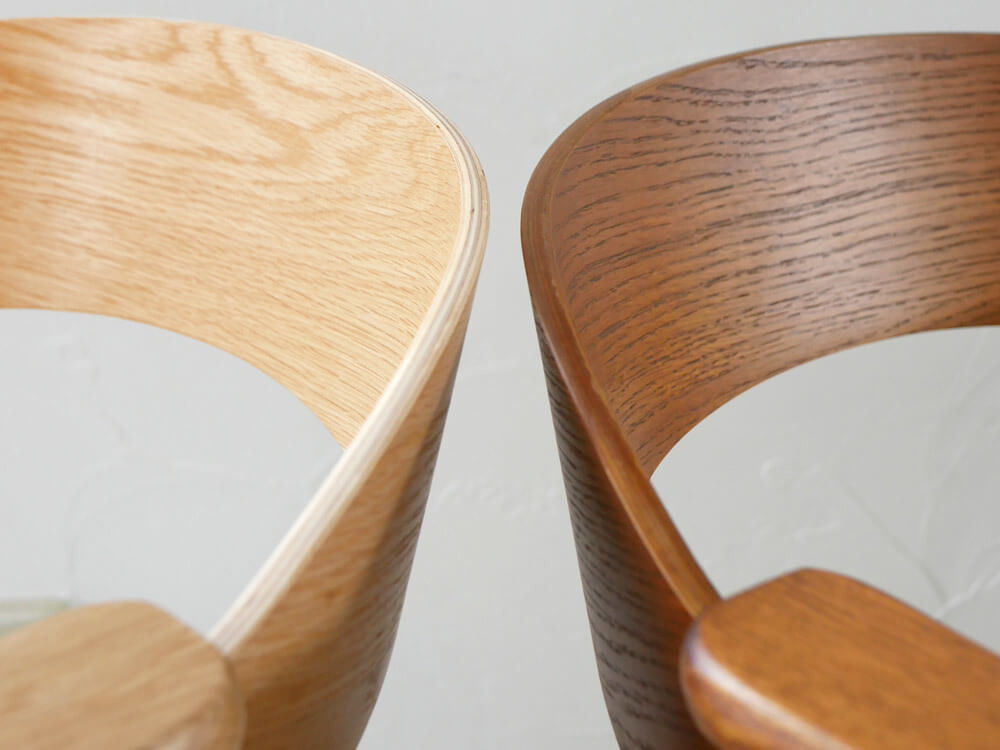 背もたれの素材は、オーク材からできており、涼しい地域で長い年月をかけて成長する木の為、密度が高く強度にも優れている木材。細かく美しい木目も特徴的です。