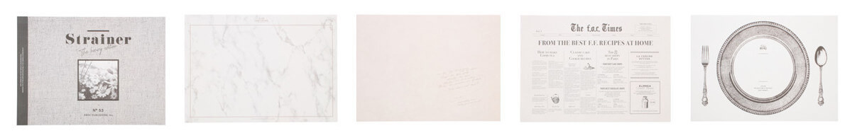5種類のデザインで様々なテーブルコーディネートを楽しめる紙のランチマットです。撮影の背景などにも使用できます。