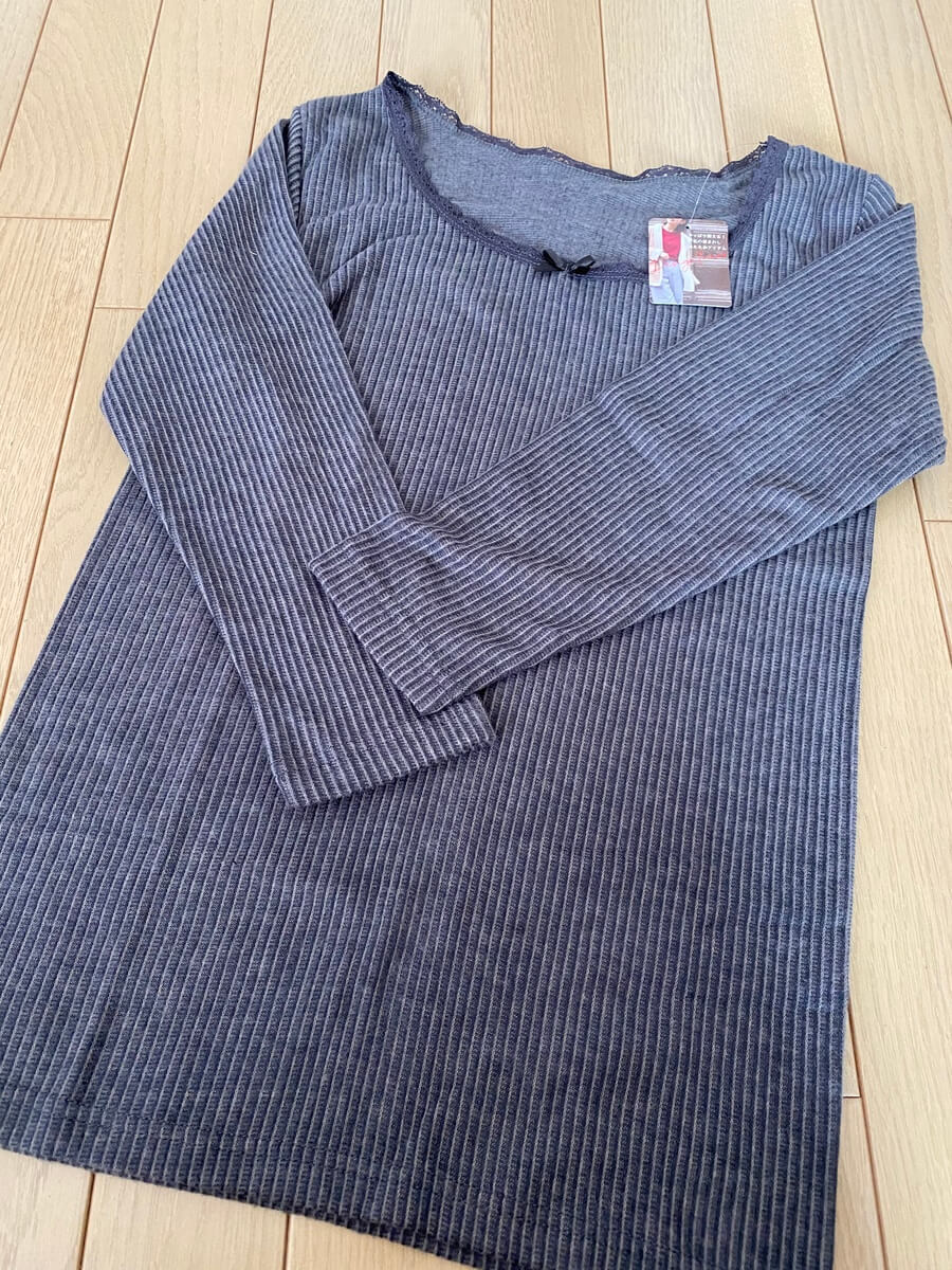 襟元にレースがついていて、細かなボーダー柄。人から見えるものではないけど、可愛さももちろん暖かさも大事ですよね。 内側が、起毛になっているので本当にあったかいアイテムです。