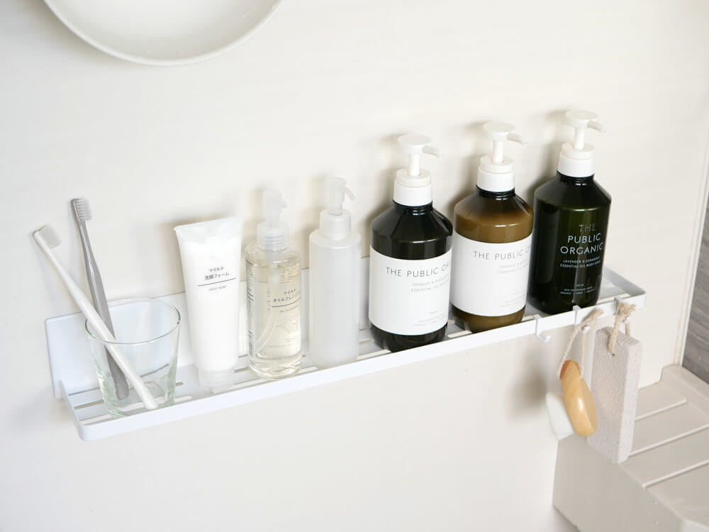 浴室壁面にマグネットで付ける、幅60cmのロングラック。バスグッズたちを浮かせて一括収納できるので、お掃除もらくらく。
