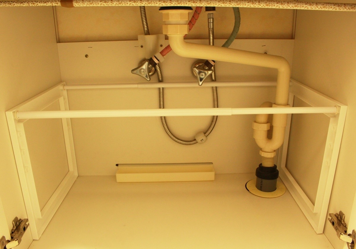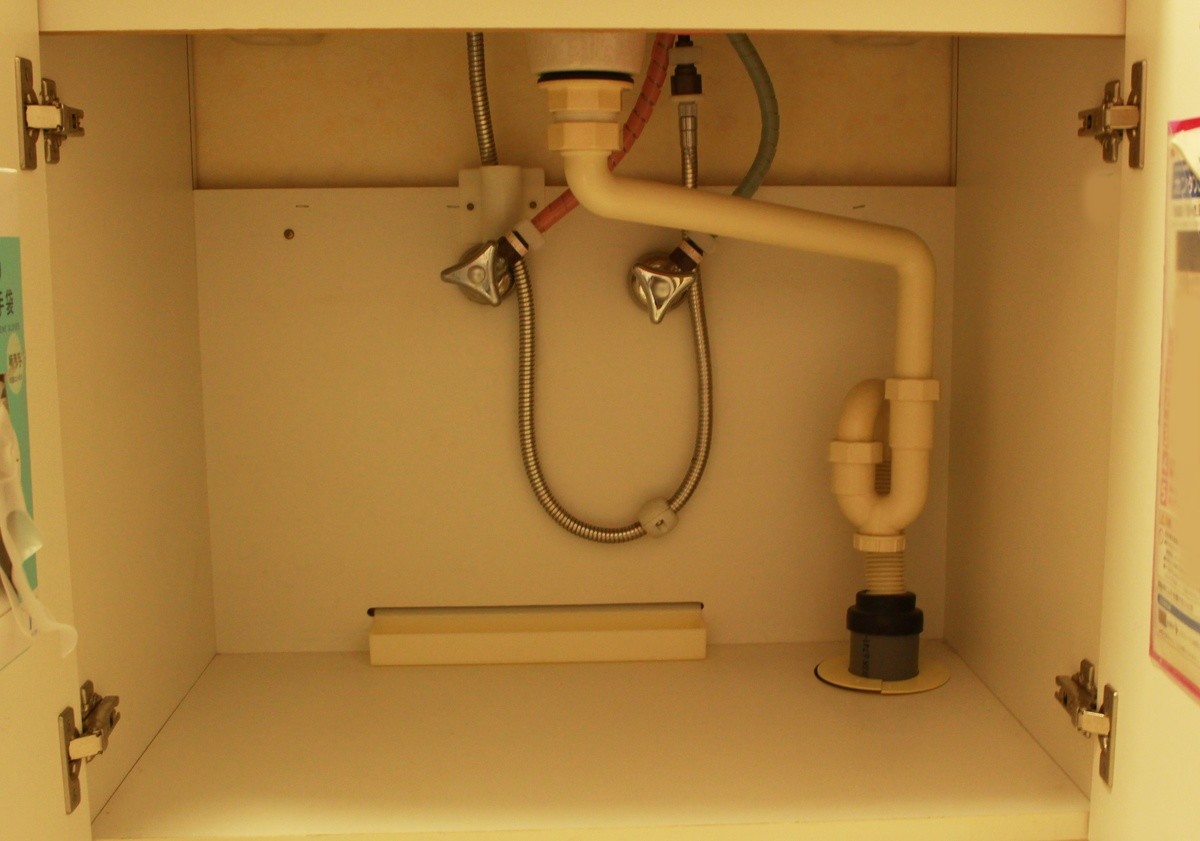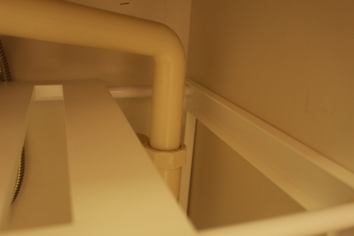 空間としては広いですが、排水パイプやホースが取り付けられています。