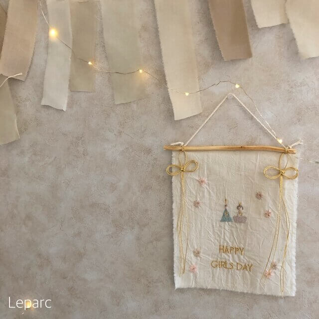 繊細な刺繍とナチュラルなカラーが大人気の「ひな祭りタペストリー」です。子どもっぽすぎず、大人っぽすぎない、絶妙なデザインが可愛い作品です。こちらのタペストリーを飾るだけで、充分!と思えるような作品です。