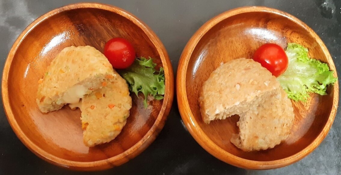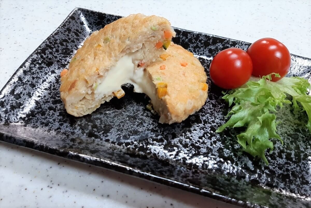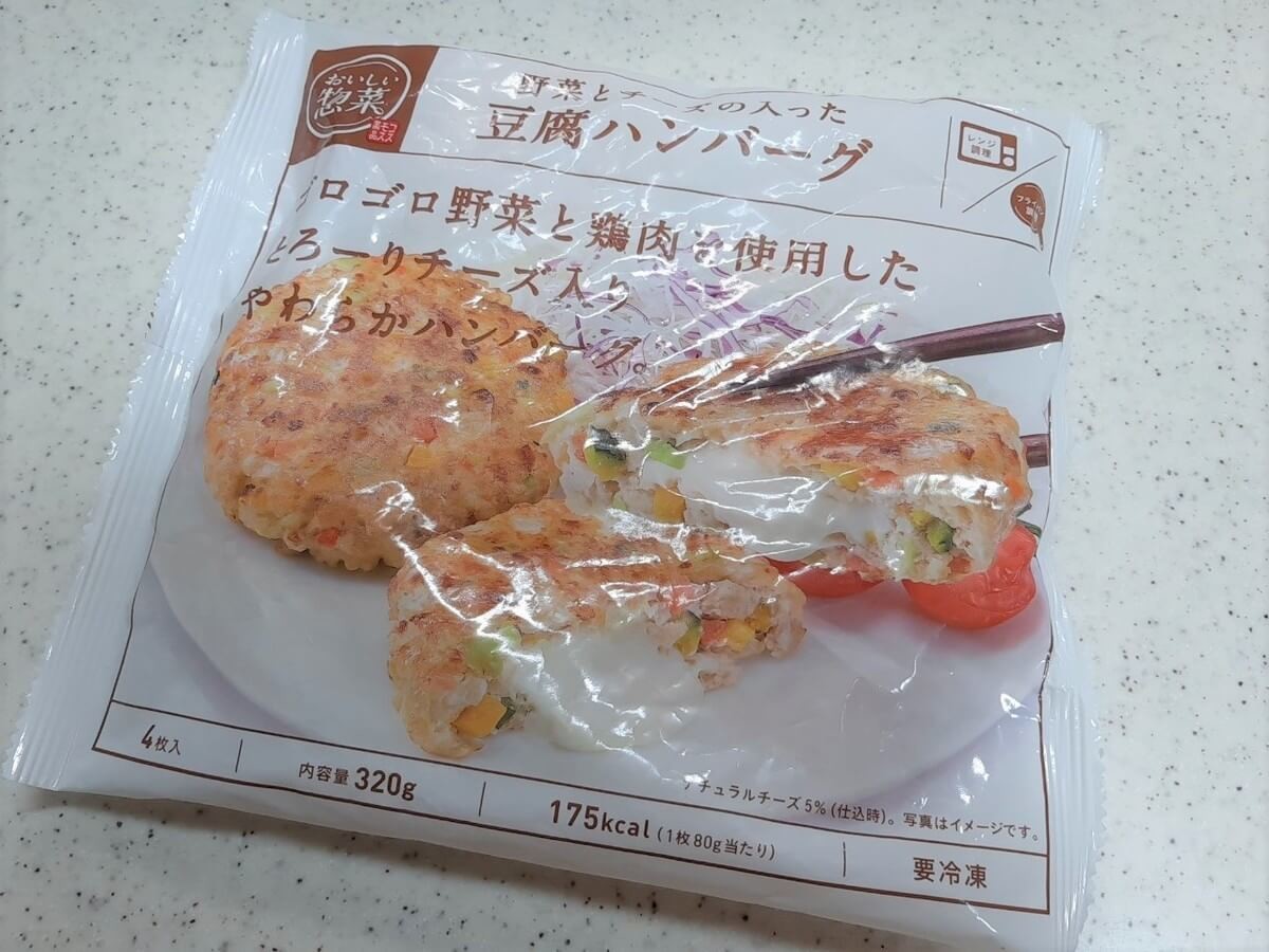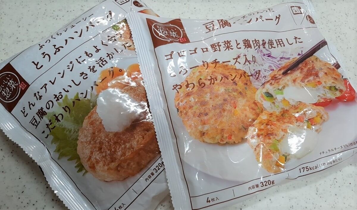 ふっくらジューシーとうふハンバーグは1個あたり約75円、野菜とチーズの入った豆腐ハンバーグは一個あたり約95円とどちらも100円以内とは思えないクオリティーです。