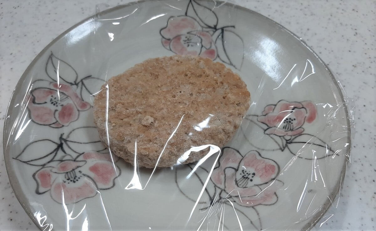 先ほどと同様電子レンジ調理にします。 お皿に凍ったままのハンバーグを置いたらラップをしてレンチンするだけ。