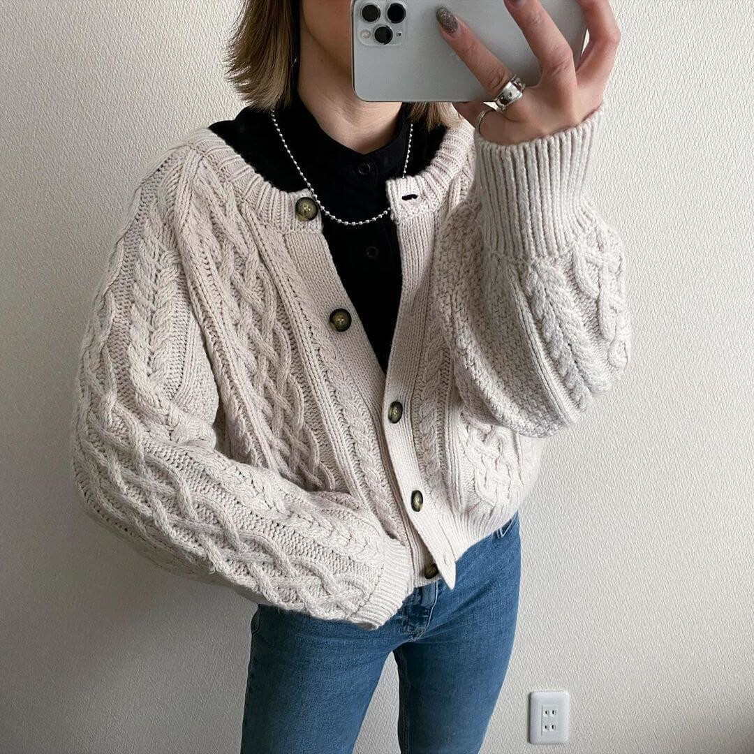ケーブルカーディガンを羽織った大人可愛いコーデ