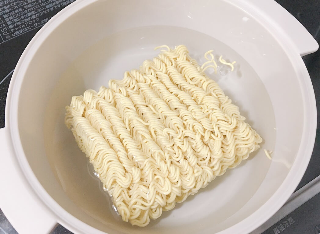【1】即席めんに記載されている容量の水・またはお湯を容器に入れて、即席めんを入れる