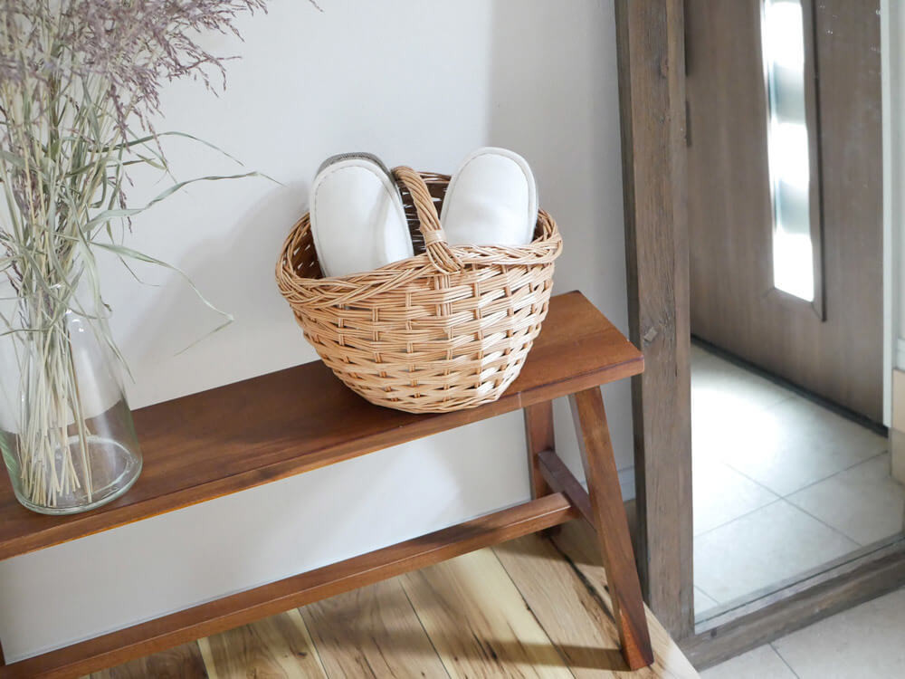 玄関ではスリッパをあえて隠さず、バスケットに入れてお洒落感を演出しちゃいましょう。持ち手があるのでお掃除の時にも楽ちんで、その持ち手があるお陰でスリッパが倒れず、図らずも雑多な印象になりません。