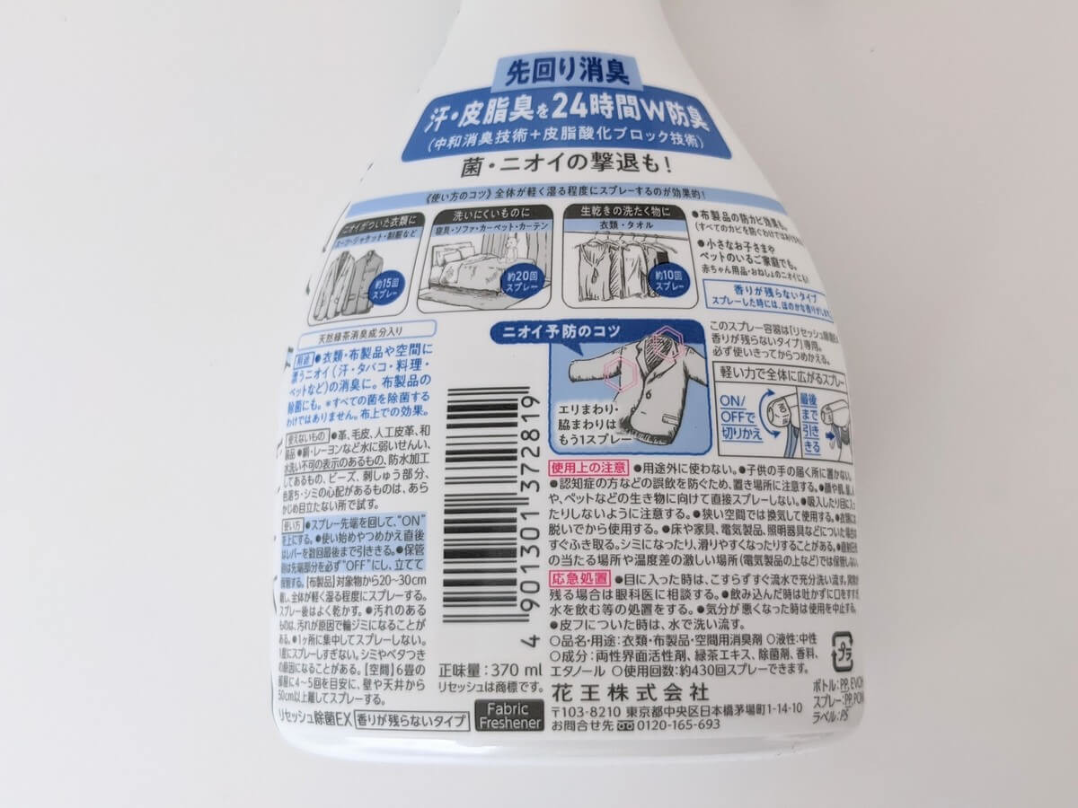 こちらも裏側を見ると、〝本当にリセッシュだったんだ〟と実感。 菌やニオイを撃退してくれるだけでなく、99.9%除菌という優れた効果を発揮してくれます(すべての菌・ウイルスを除去するわけではありません。布上での効果です)。