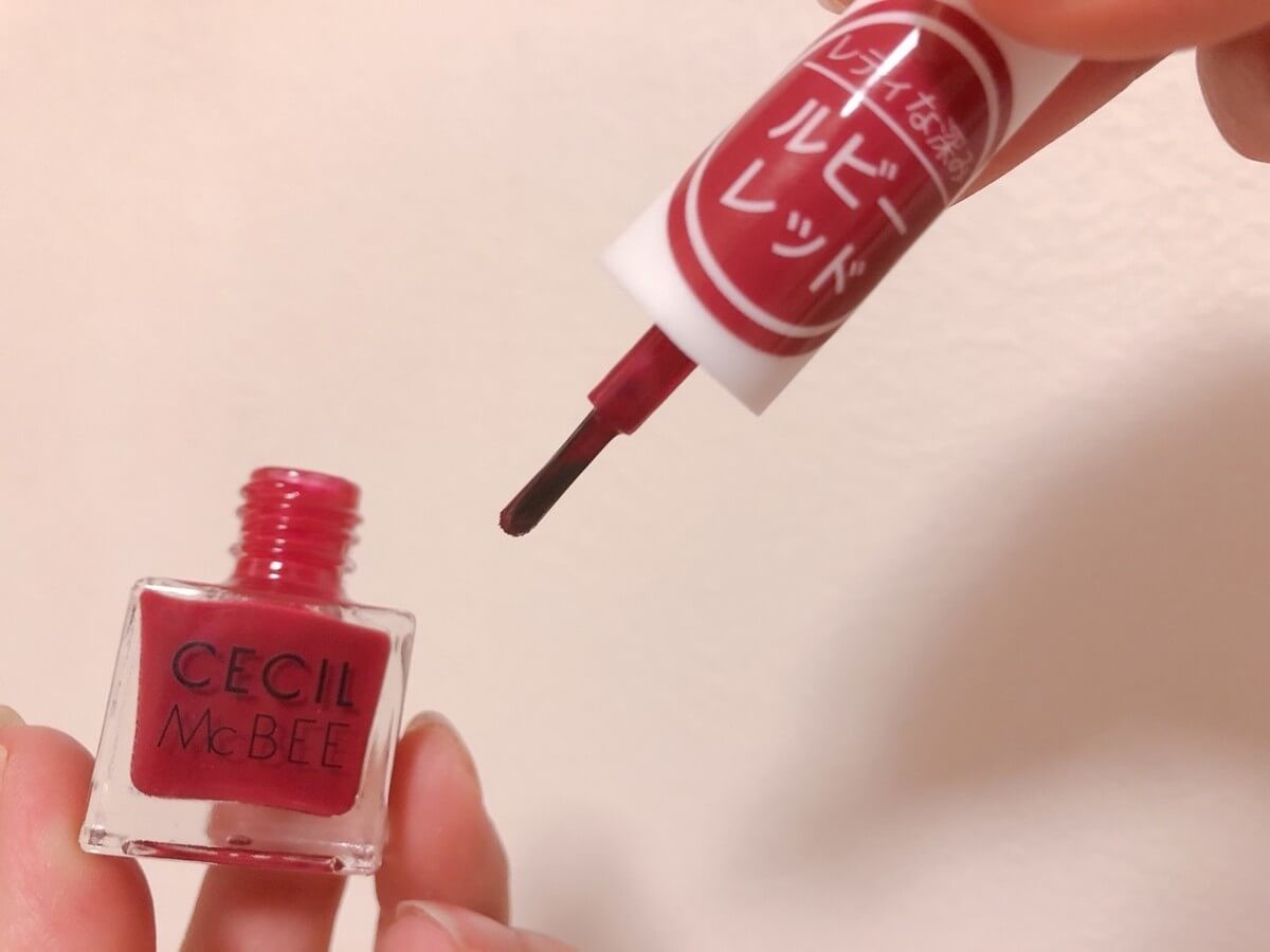 1度塗りだと明るい赤色に見えますが、重ねるごとに赤みの強さが変わります。個人的には3度塗りぐらいがベストです。