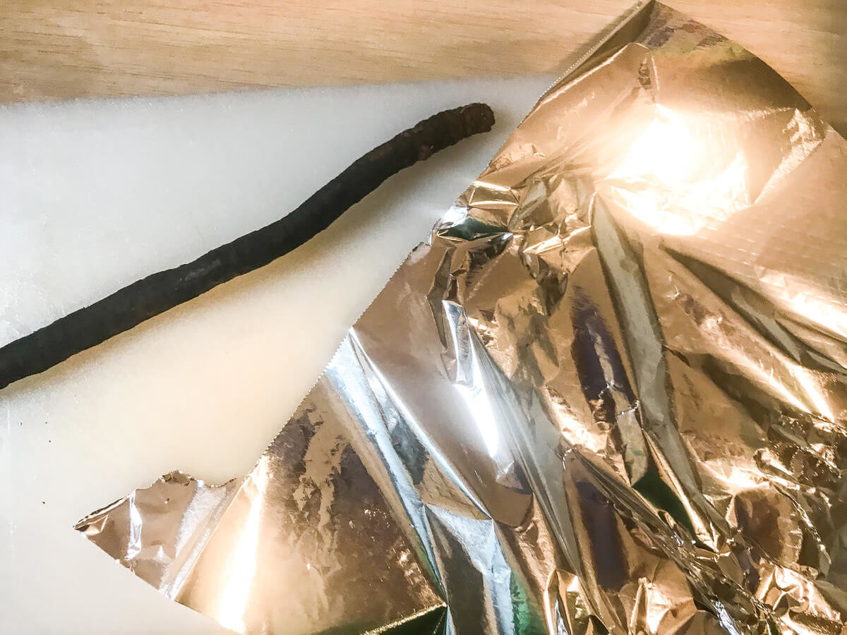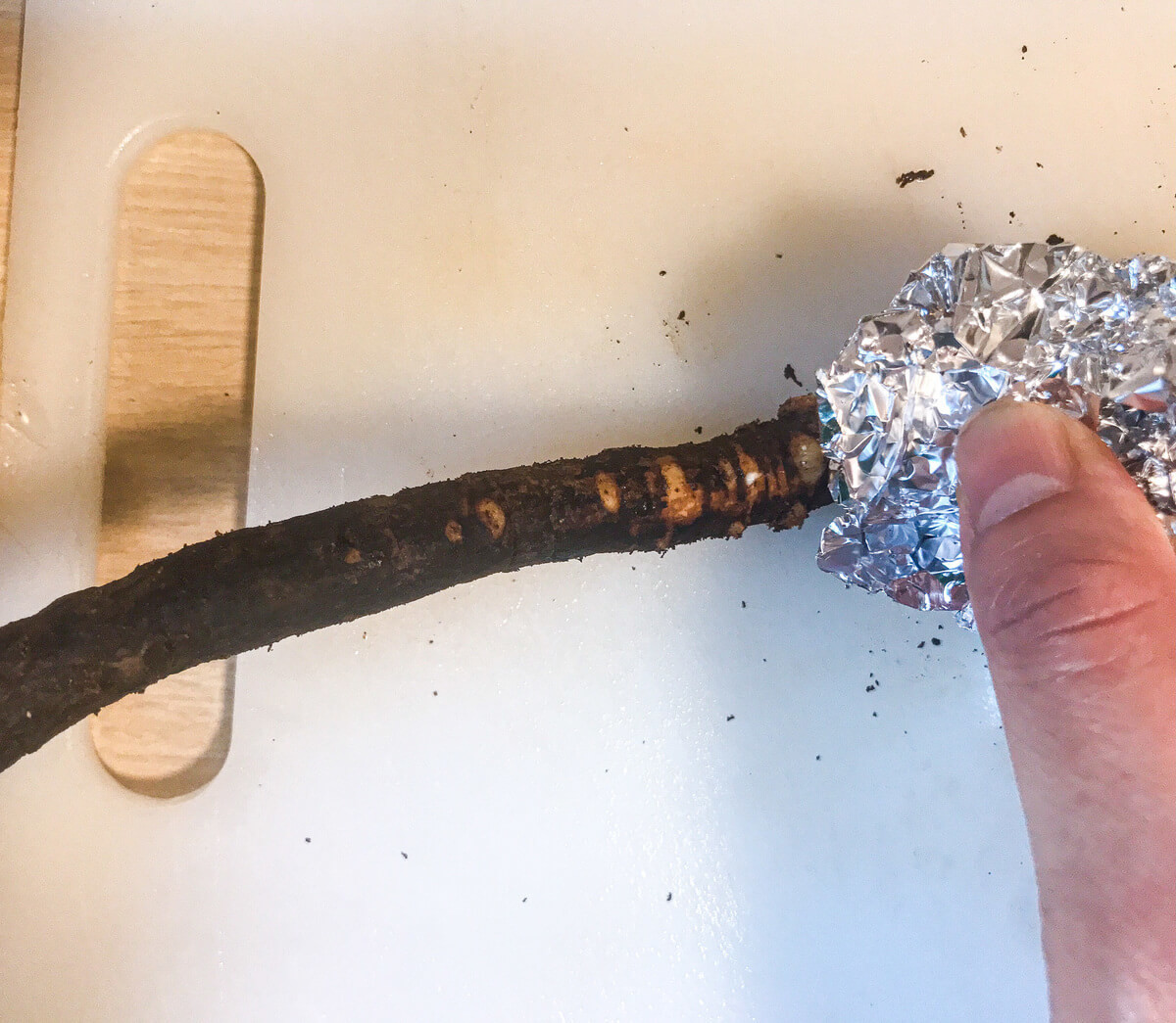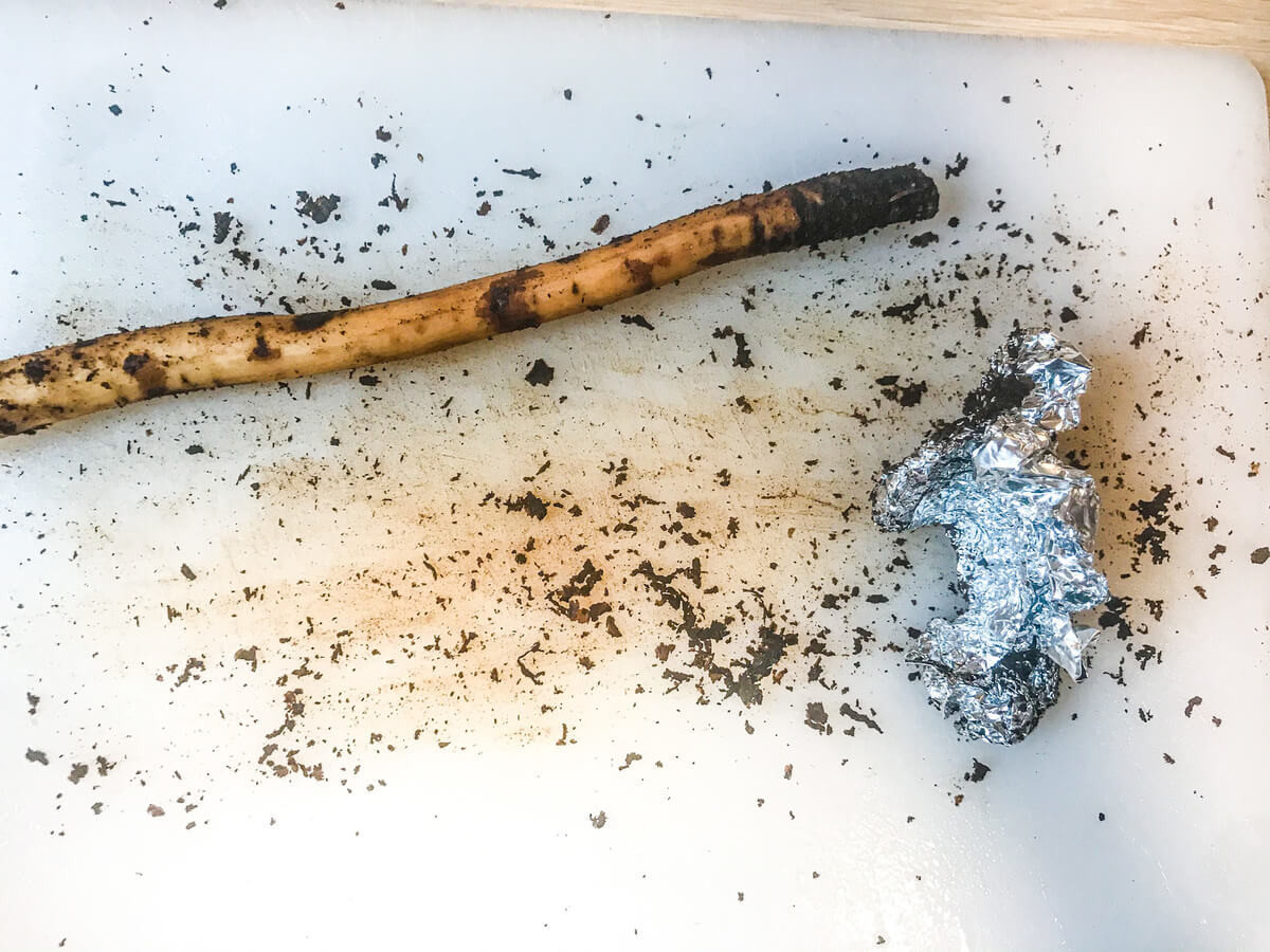 適当な大きさに切ったアルミホイルを、1度クシャクシャにします。破らないようにそっと広げたアルミホイルをごぼうにあてて、こするだけ!