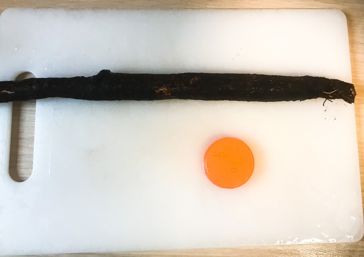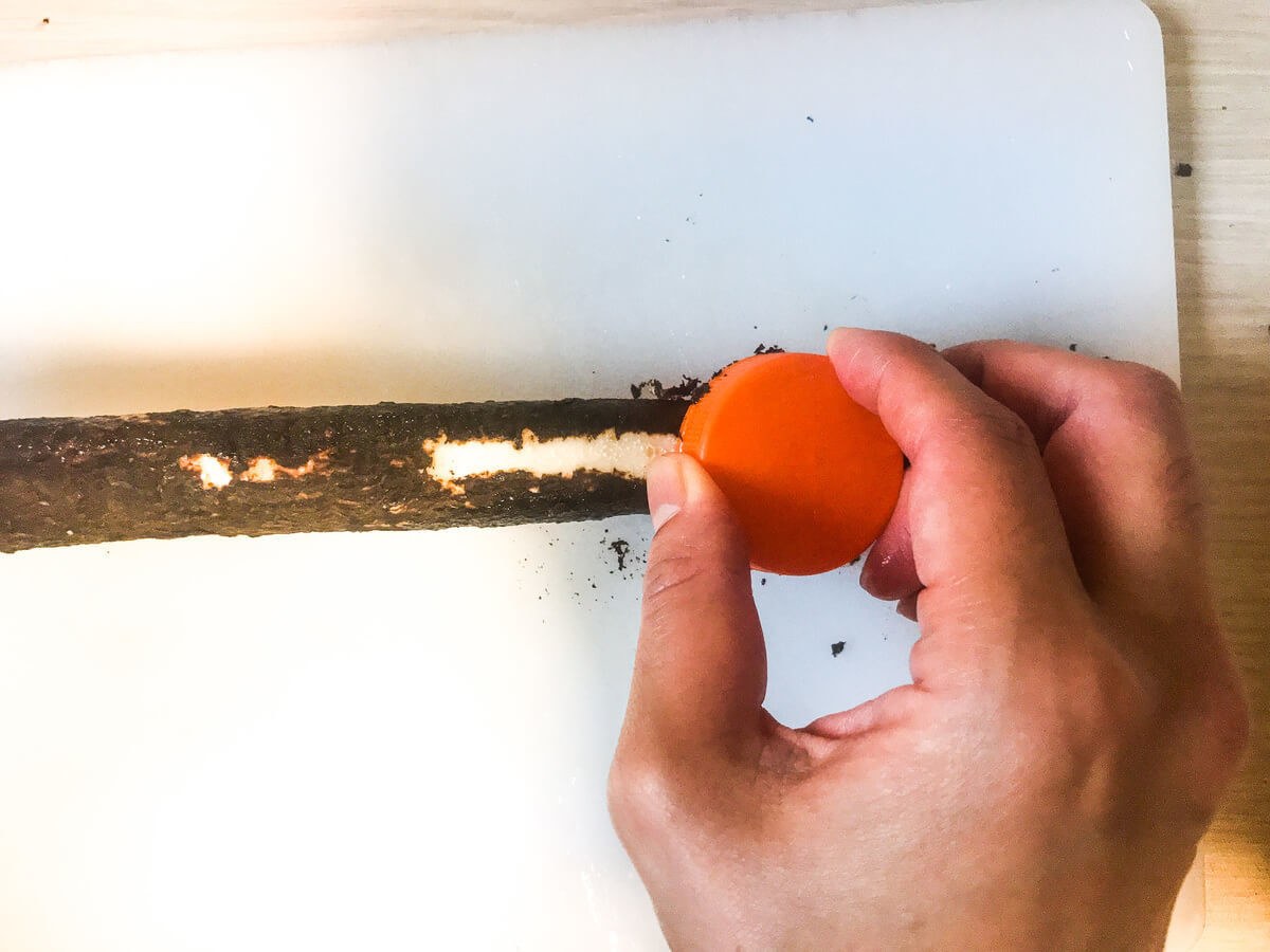ペットボトルのキャップをごぼうの表面にあてがい、横にスーッと動かすだけです。