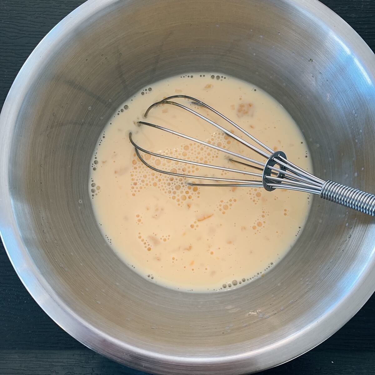 大きめのボウルに卵を割り、泡だて器(手動でもよい)を使ってよく混ぜましょう。そこに牛乳と砂糖を加えて、しっかりと混ぜ合わせます。