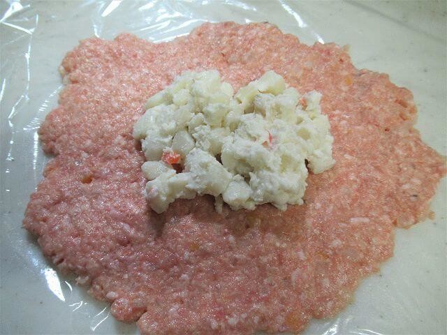 真ん中に、業務スーパーの「ポテトサラダ」を置いたら、ラップごとクルっと上に被せて整えます。