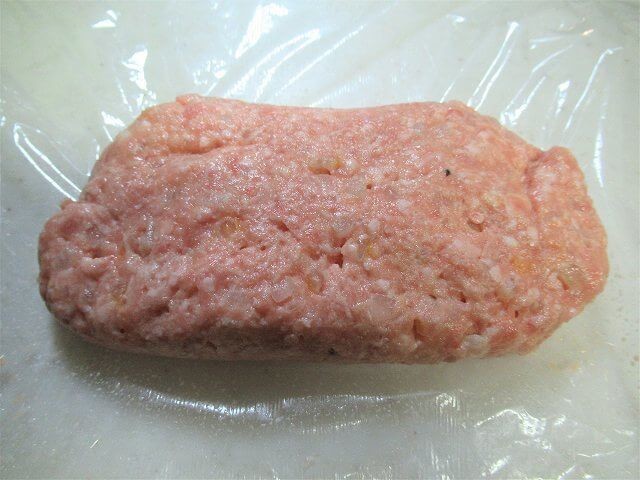 ラップを引いて、ハンバーグの種を薄く広げます。