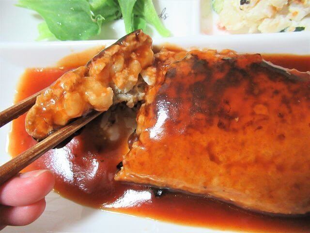 注意点としては、真ん中にポテトサラダが入っているため、ひっくり返すときに割れやすいこと。実際に割れてしまいましたが……(汗)