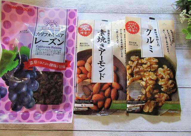 ダイソーではキッチングッズやお菓子だけでなく、ナッツやドライフルーツ類も充実しています。