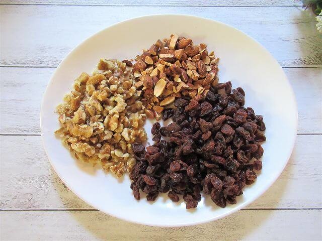 このとき、手を切らないように気をつけてくださいね。レーズンはそのままですが、ナッツ類はカットしてお皿に全部出してみると……。