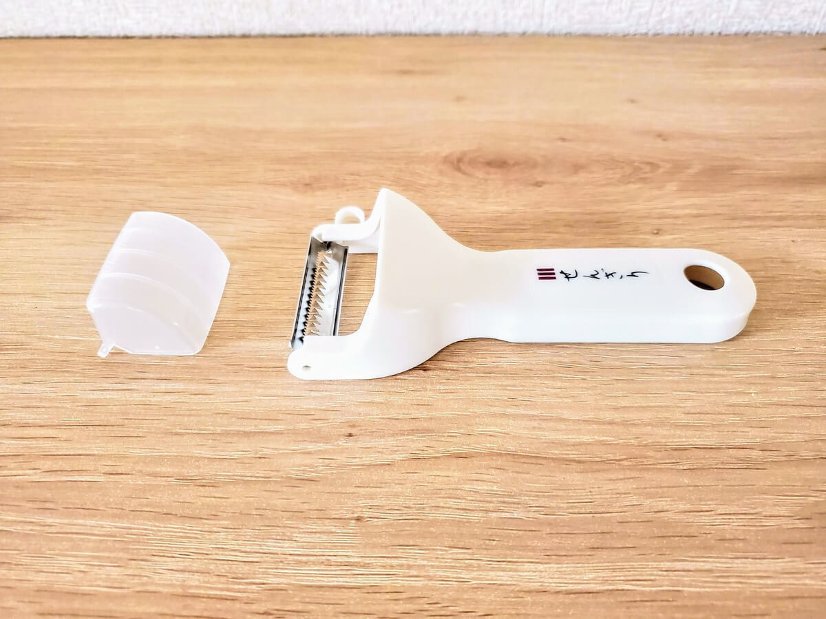 最近では皮むきができるだけでなく、野菜を千切りにしたり、網状やクルクルとしたカール状にしたりと、多種多様なピーラーが販売されています。値段もピンからキリまである中、今回は、ダイソーの「具材が散らない千切りピーラー」なるものをご紹介します。
