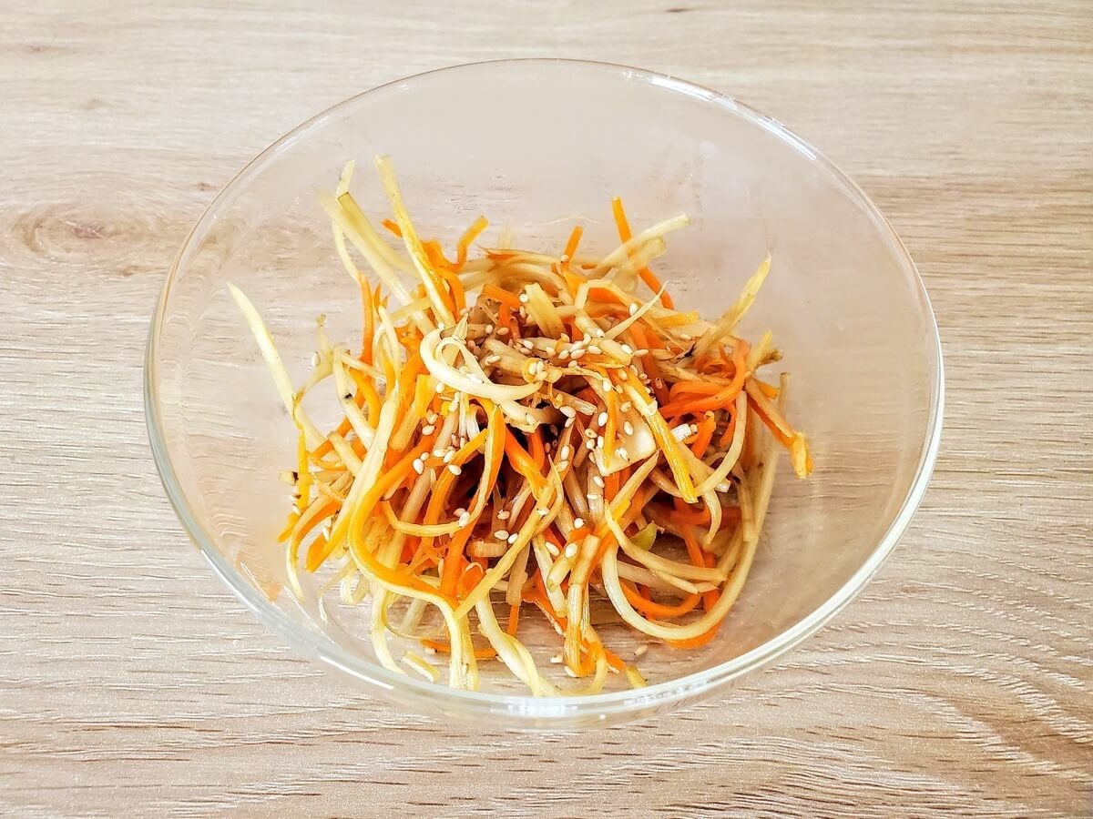 全てを合わせて、お酢や醤油、ごま油などで味付けすれば立派なサラダの完成です。