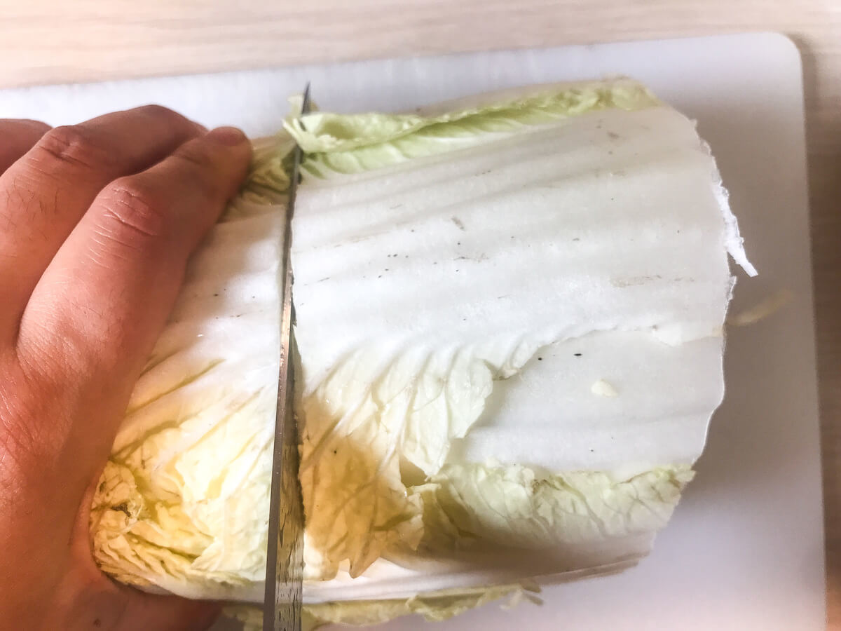 白菜の根元を、鍋の深さと同じくらい分厚く切りましょう。残りの葉も同じ幅でザクザク切っていきましょう。