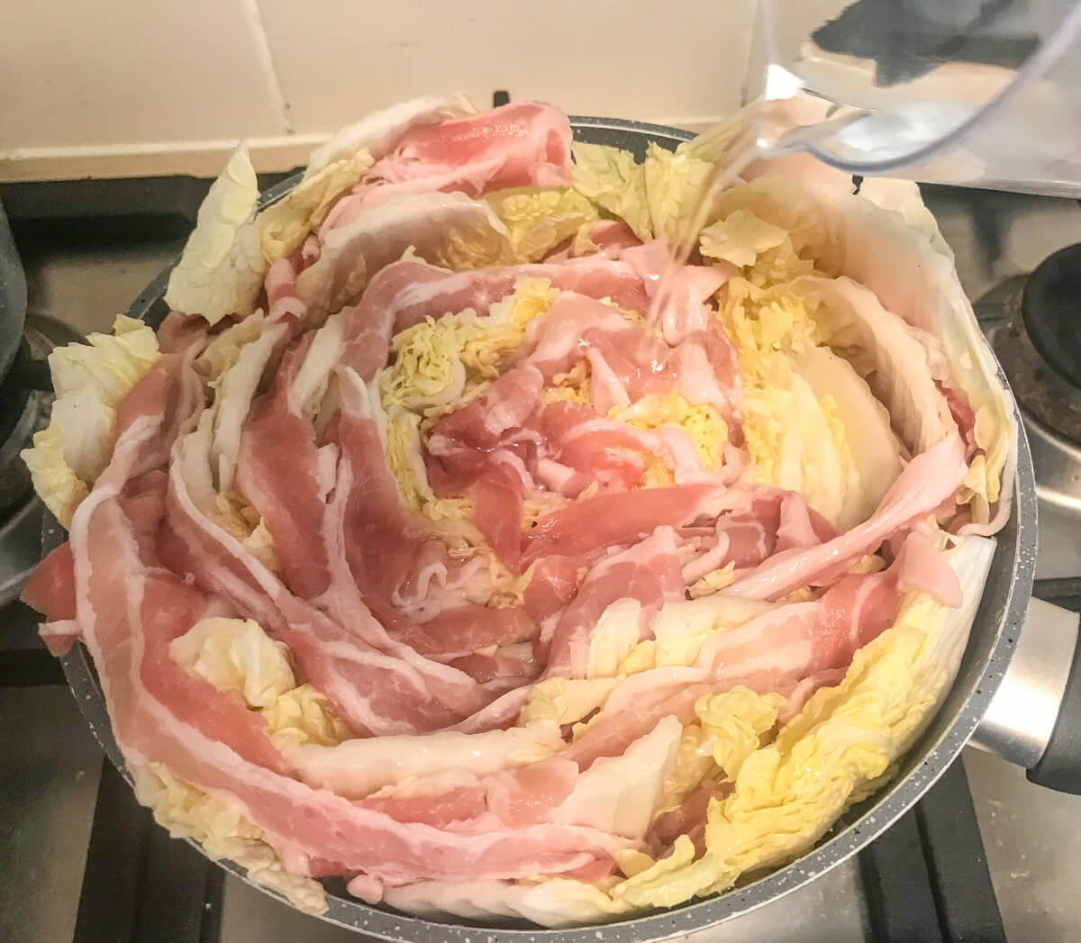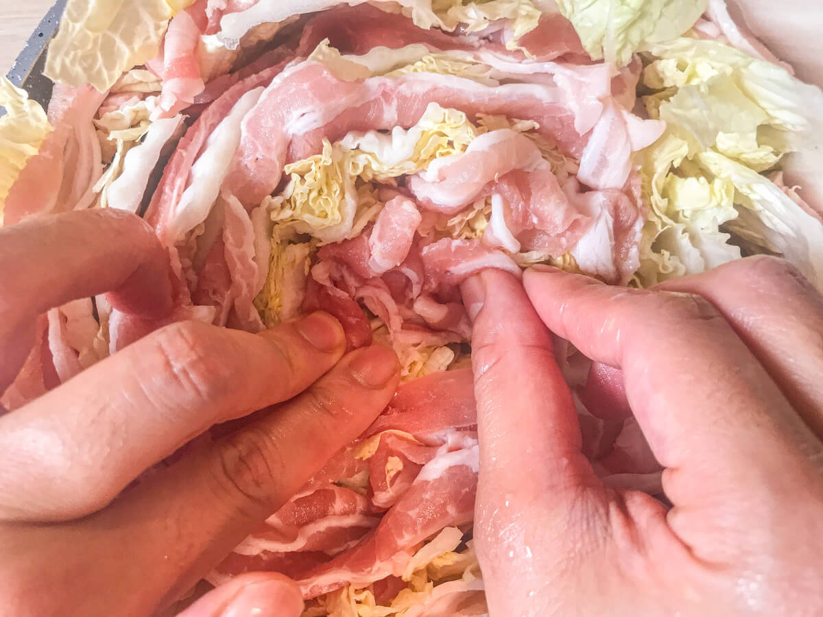 豚バラ肉を白菜の間に差し込みます。豚肉同士が重ならないように入れると、お鍋の中でお花が咲くように見えます。