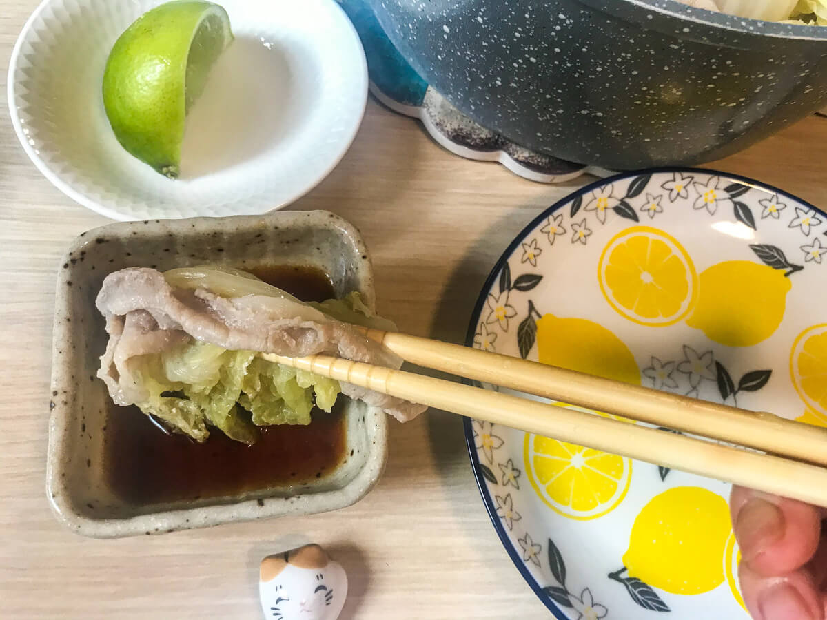 今回、ライムをかけて、ポン酢を付けて食べました。豚バラ肉のうま味と白菜のさっぱりとした甘みの相性は抜群!
