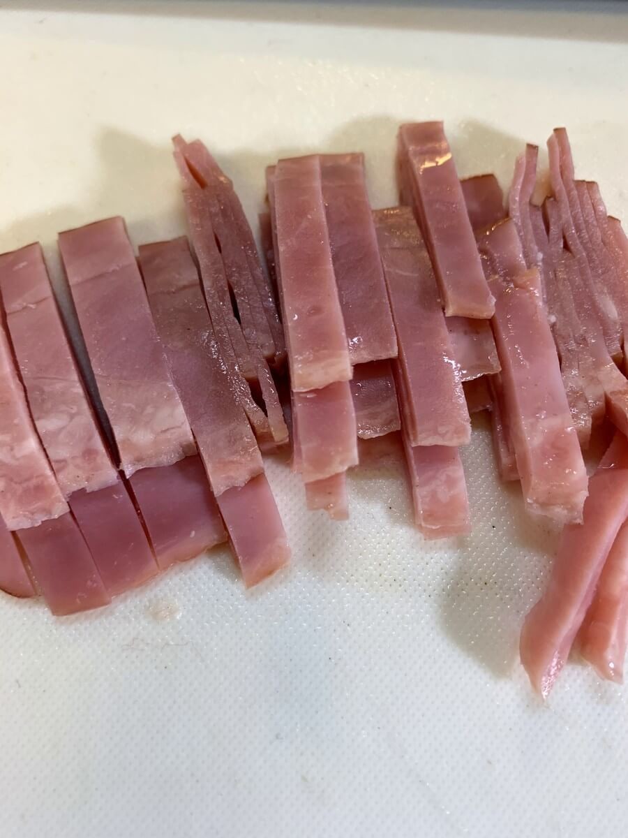 ベーコンは幅およそ5mmの細切りにし、(お好みで入れたい方は)白ごまも細かく刻みましょう。
