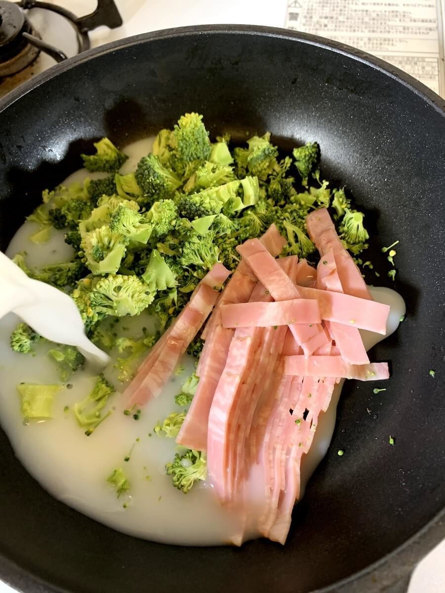 ①で切ったベーコン・ブロッコリーをフライパンに入れ、牛乳と水(220ml)を加えたら「中火」で沸かします。