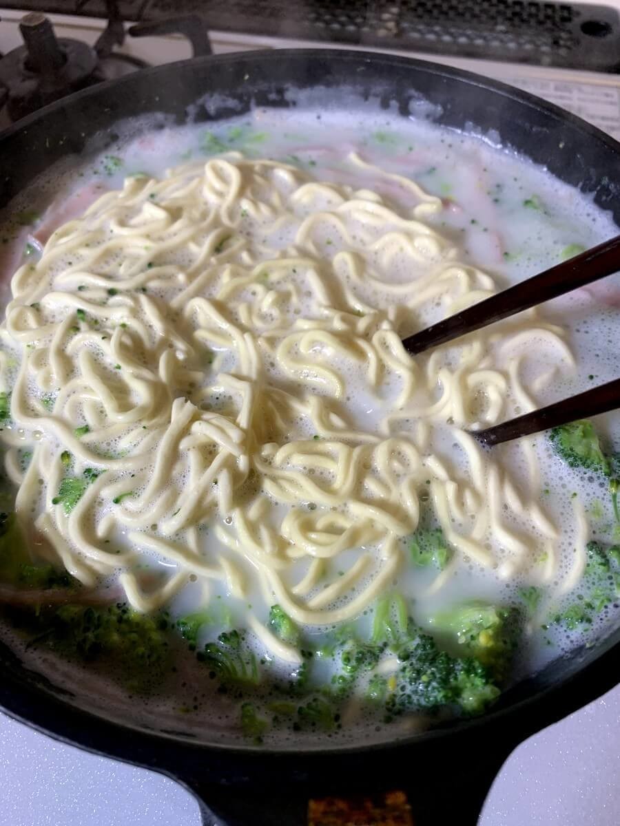 濃厚塩カルボ麺作り方③麺を入れて弱火で茹でる