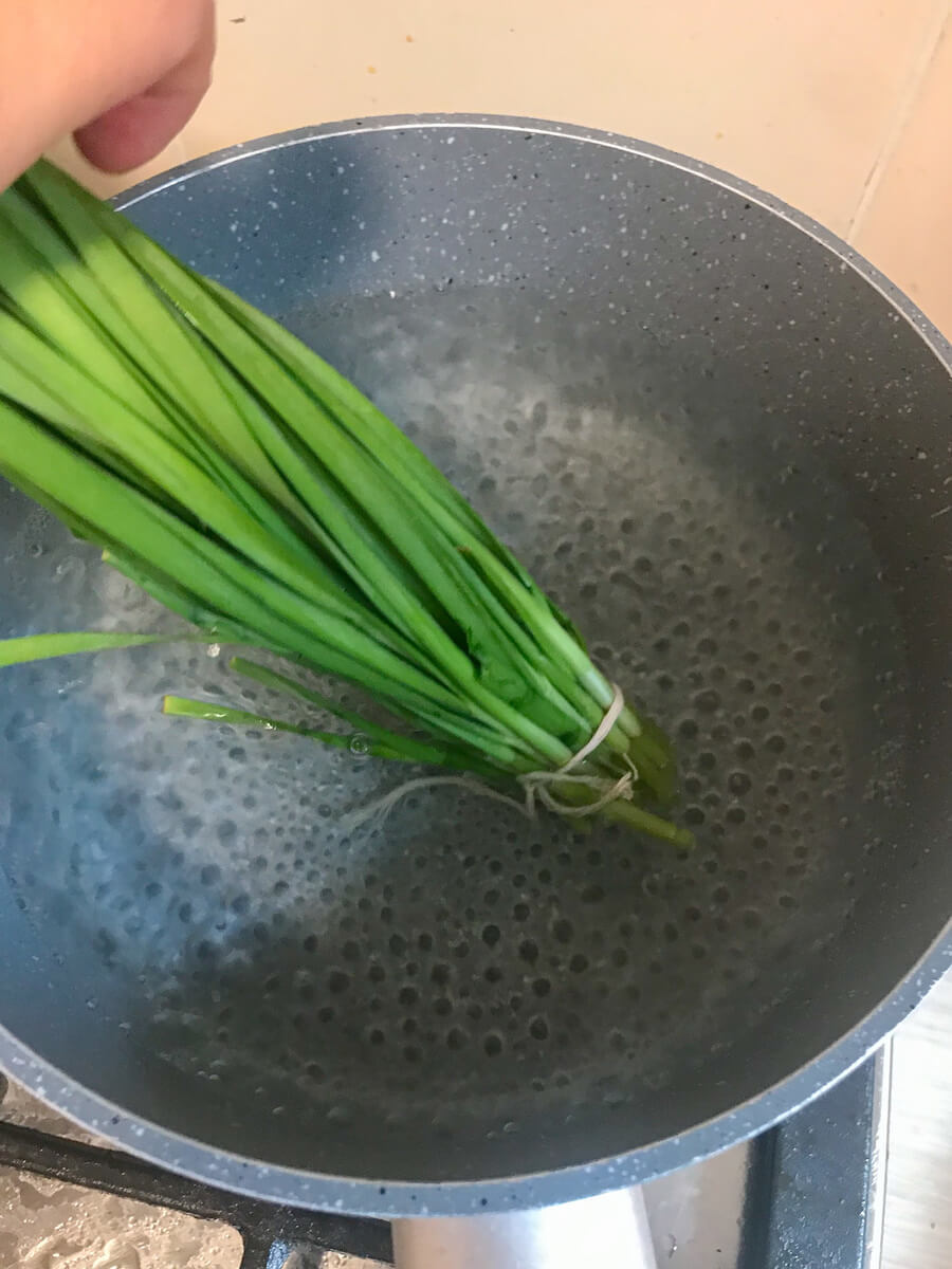鍋に水を沸騰させ、ニラを数分茹でましょう。沸騰させた湯で茹でることで、ニラの緑色がさらに鮮やかになります!