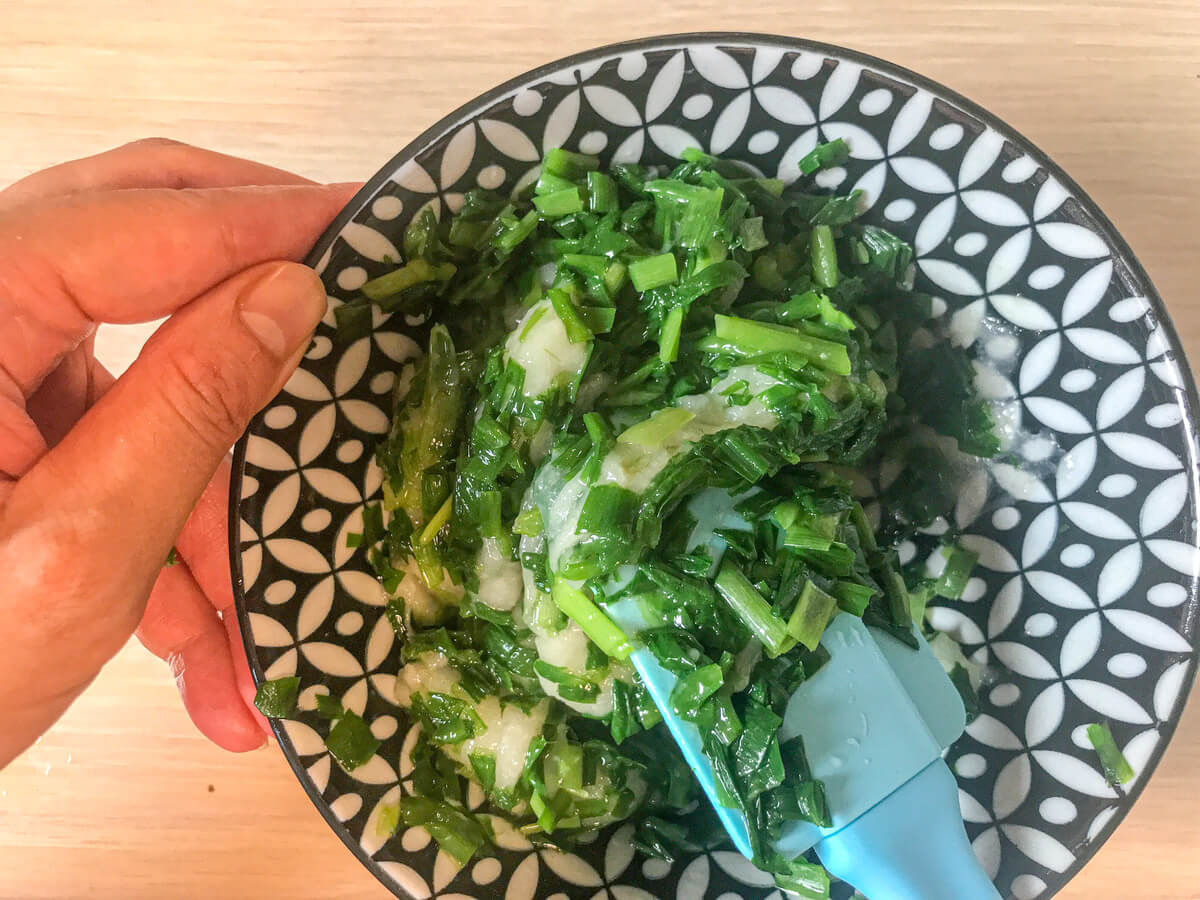 温めたお餅をお皿に移し、刻んだニラを加えたら、ヘラでまんべんなく混ぜ合わせます。