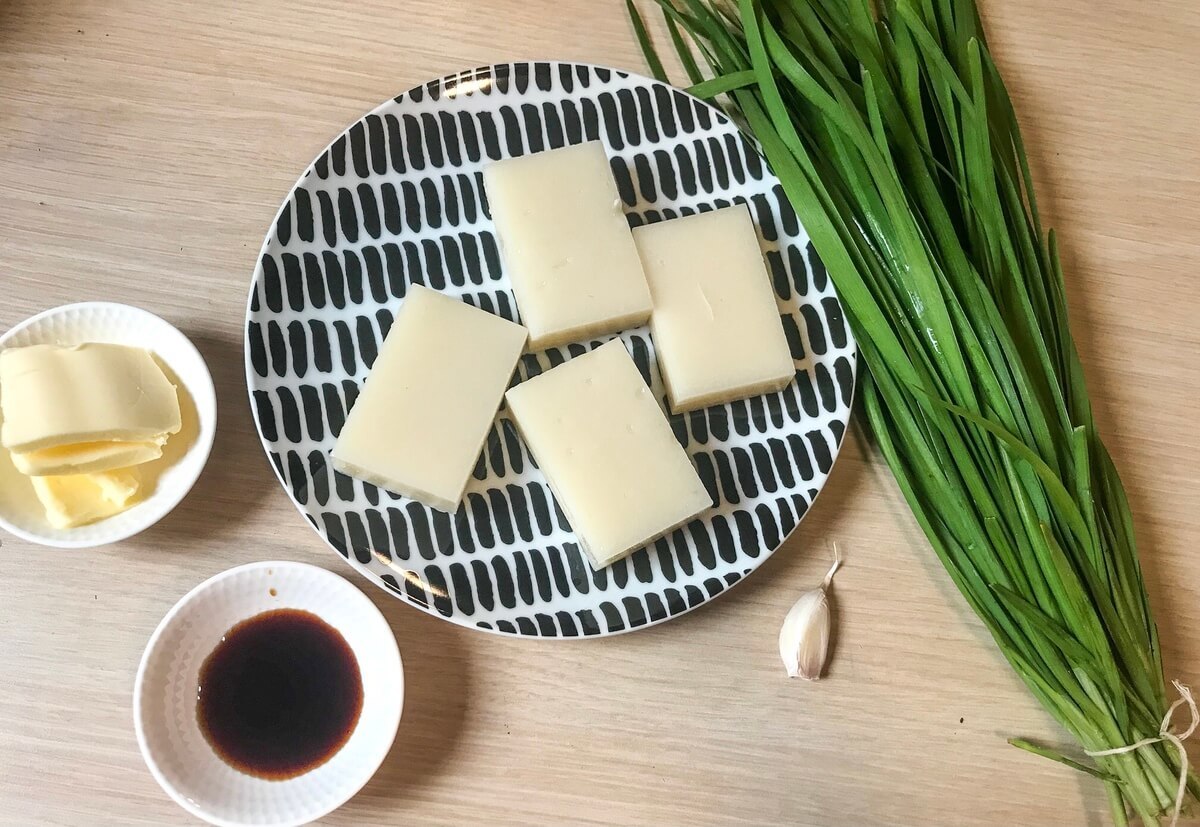 フライパンに刻んだにんにく、バターを入れて炒めましょう。その後、醤油を加えて、混ぜ合わせたら完成。ニラ餅にかけていただきましょう。
