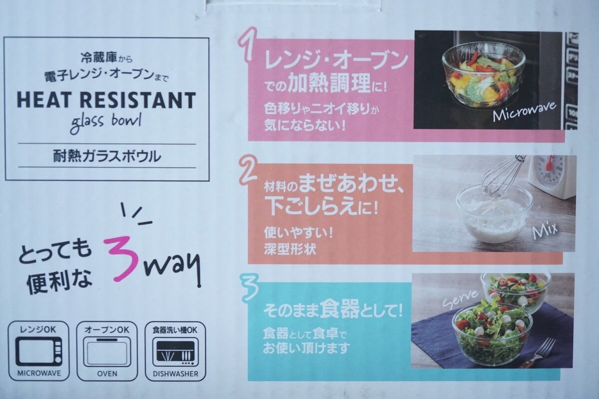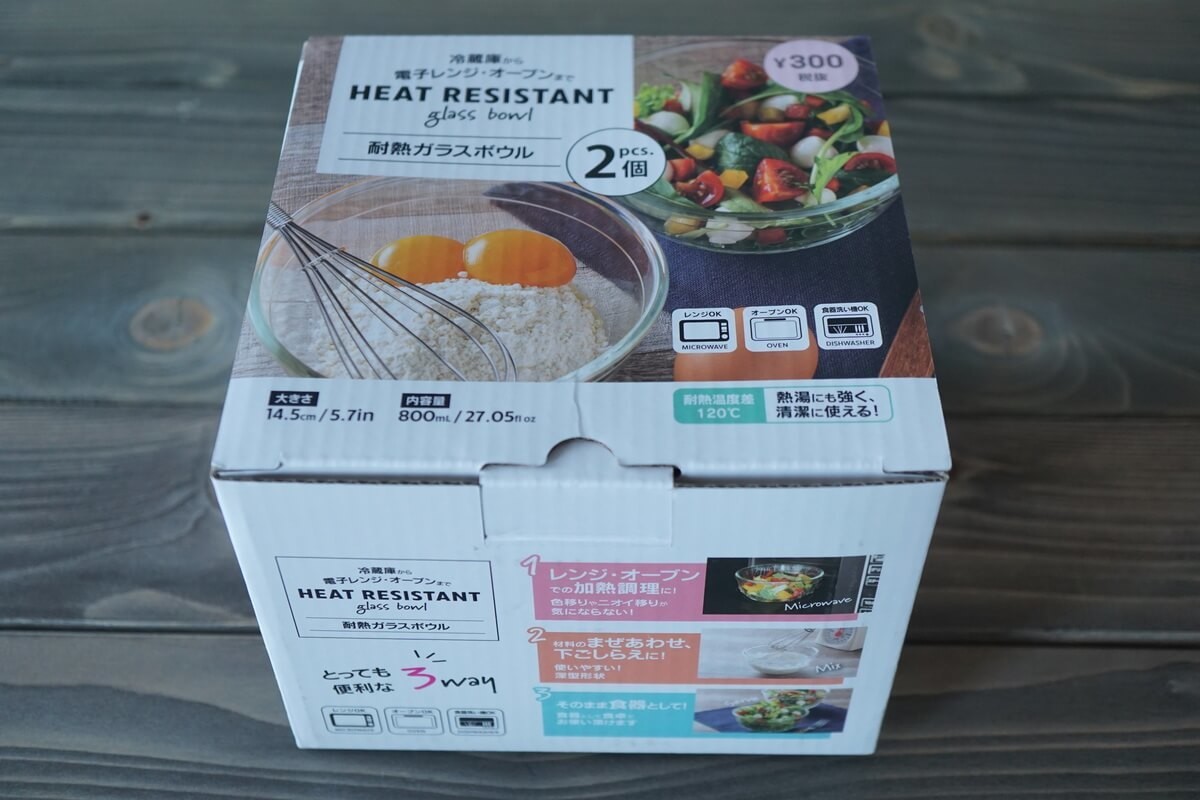 こちらは2個セットで330円(税込)ととてもお得な耐熱ガラスボウルです。