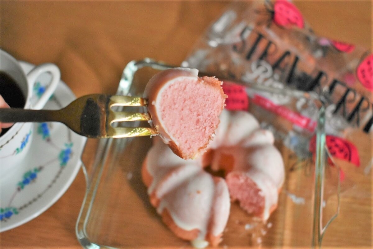 いちご風味のケーキにホワイトチョコをコーティングしたドーナツ型のケーキ。毎年この季節に限定商品として店頭に並ぶ、カルディオリジナル「いちごリングケーキ」です。