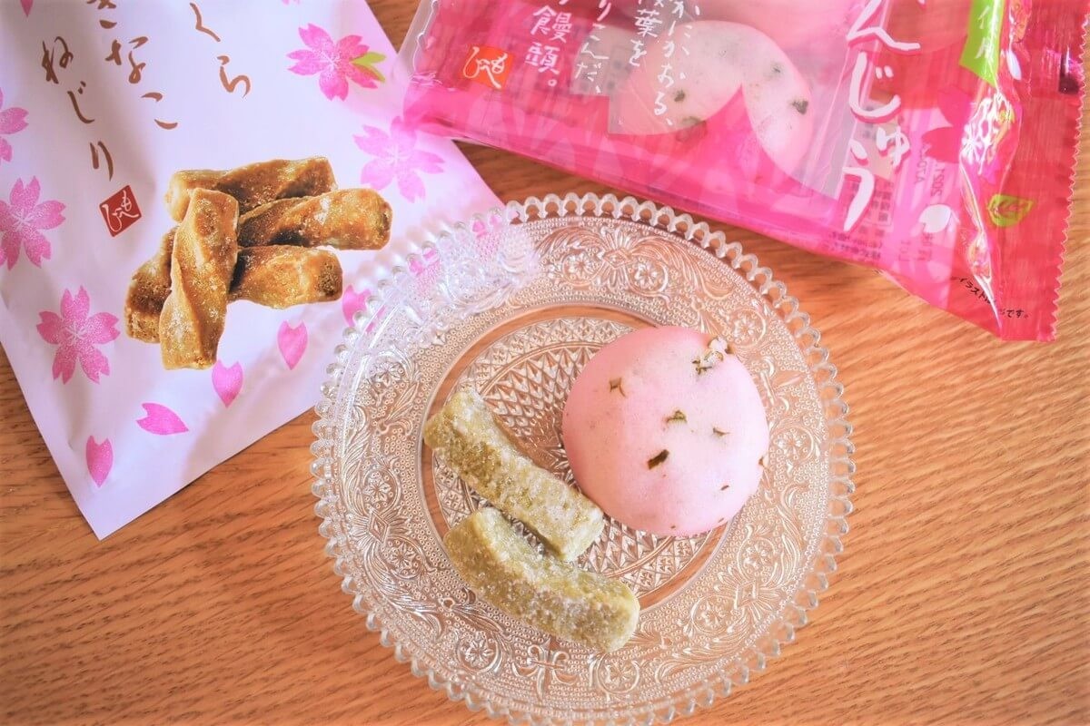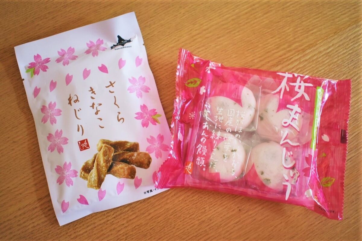 カルディのお店でも特に春を思わせるパッケージだったのが、もへじの「さくらきなこねじり」と「桜まんじゅう」です。華やかなのでお店の中でもひときわ目を引きました。