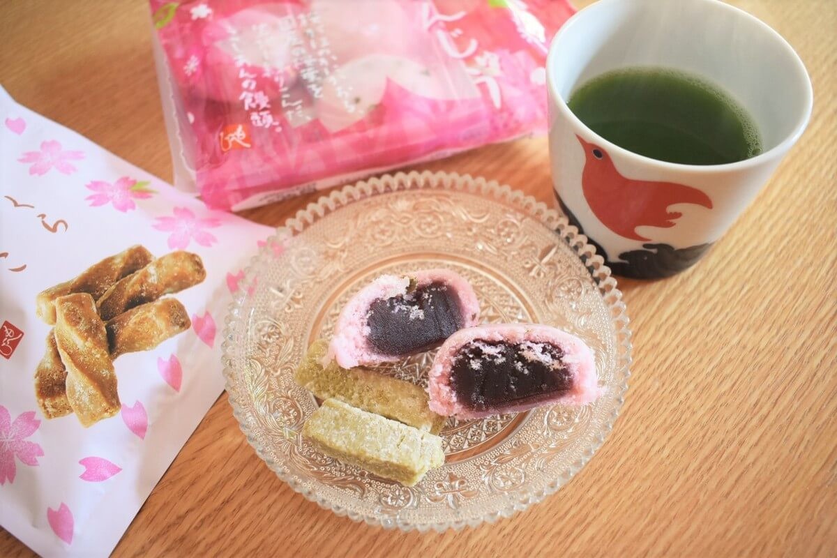 「桜まんじゅう」は封を開けた途端に春の香りがふわ~っと漂いました。思わず花見がしたくなります。皮に桜の葉が練り込まれていて見た目にもきれい。割ってみると中は“こしあん”です。