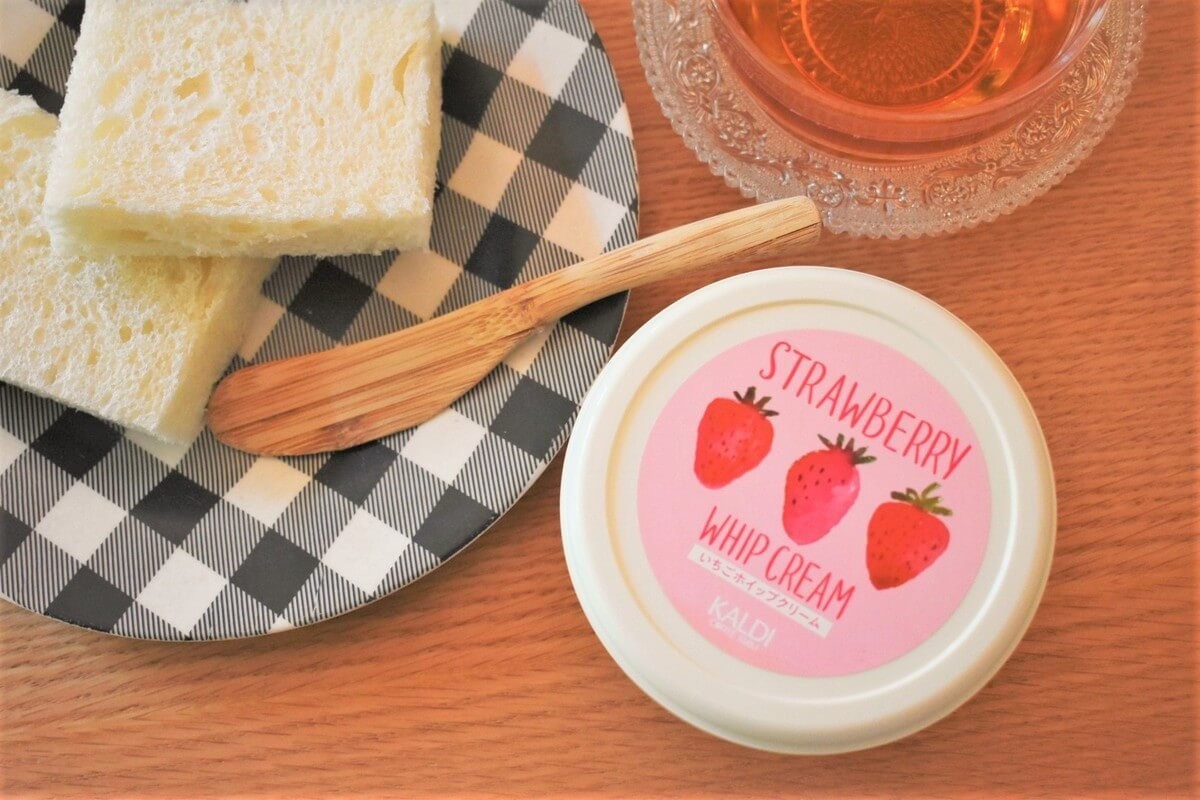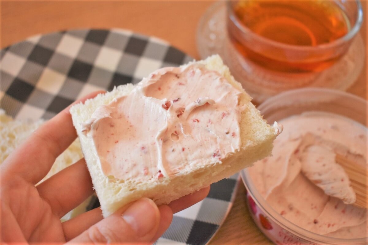 ホイップクリームという名がついているだけあります。これには耳をおとしたふんわり焼いていない食パンが似合いそうと、用意して多めに塗ってみました。これが正解!