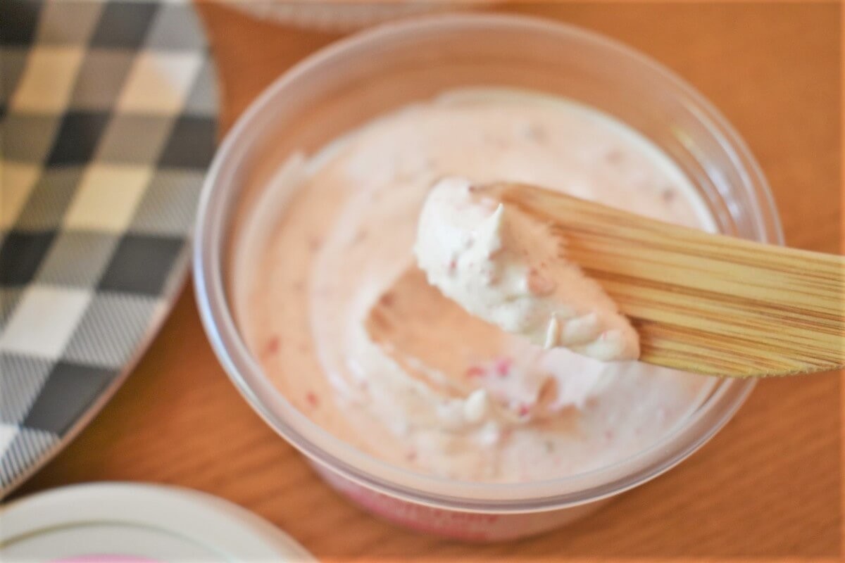 ふたを開けると、ホワイトチョコベースのクリームにフリーズドライのいちごが加わった、ふんわりホイップタイプ。もうふわふわ!