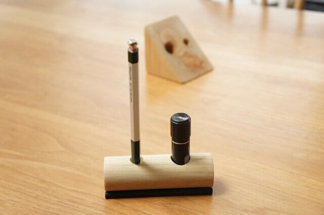 こちらのペン立ては天然木材を使用し木のぬくもりが感じられ、ハンコやペンも置くだけでインテリアの一部に!