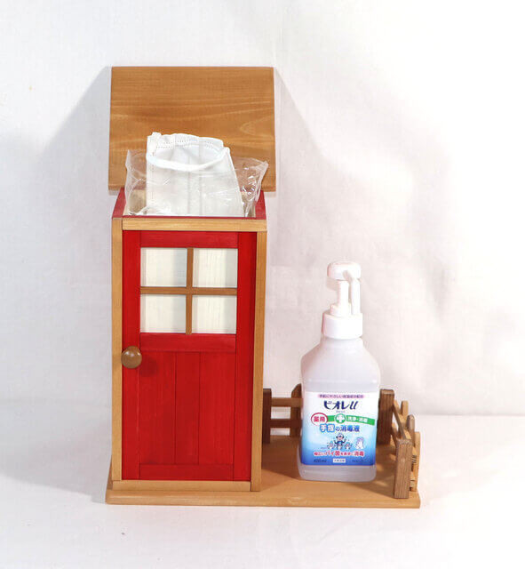 このマスクケースは小屋の屋根が開閉扉になっているので、マスクを小屋に収納すれば菌やウイルスの付着をガード。庭には消毒液をおいて玄関に設置して衛生コーナーに!