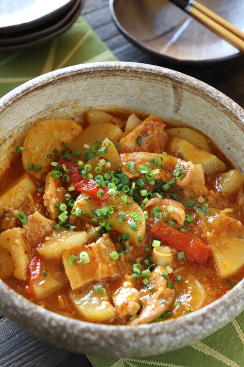 大根も入れ、大根がやわらかくなるまで、中火で15分ほど煮込む。大根がやわらかくなったら、水溶き片栗粉を回し入れとろみをつける。