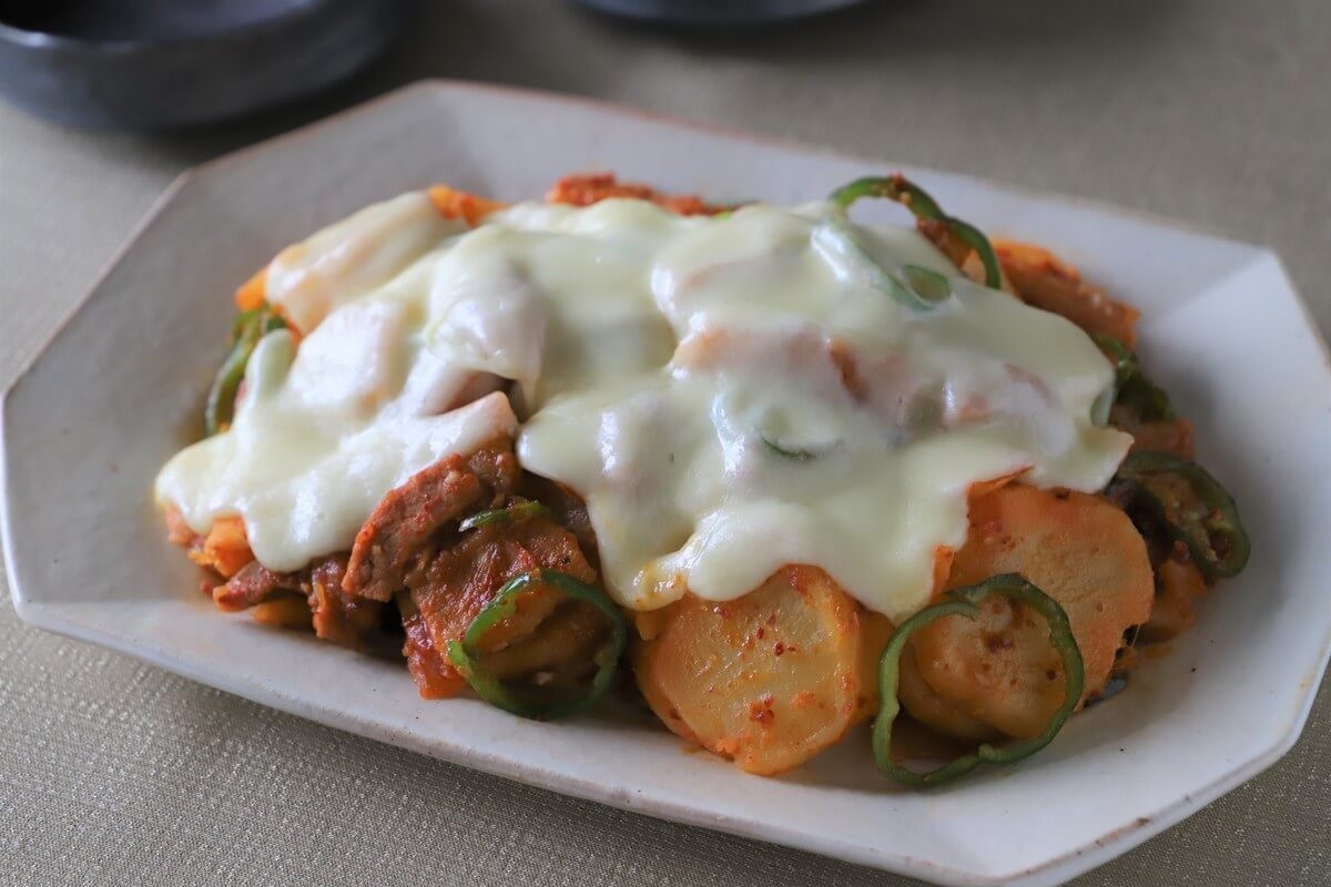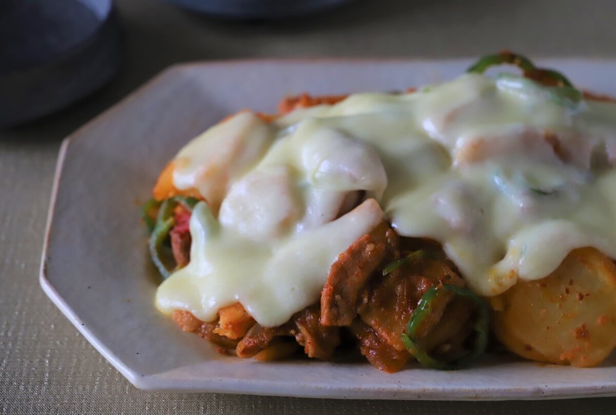 - ヤンニョム豚バラ焼肉とじゃがいものとろとろチーズがけ