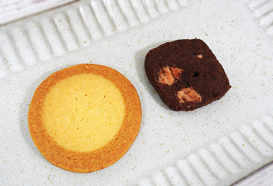 店内やネットに告知はありませんでしたが、無料サービスでクッキーを2枚もらってしまいました。ラッキー!食べてみたところ、写真左のクッキーは「キャラメルカスタード」で右側は「苺チョコキューブ」。