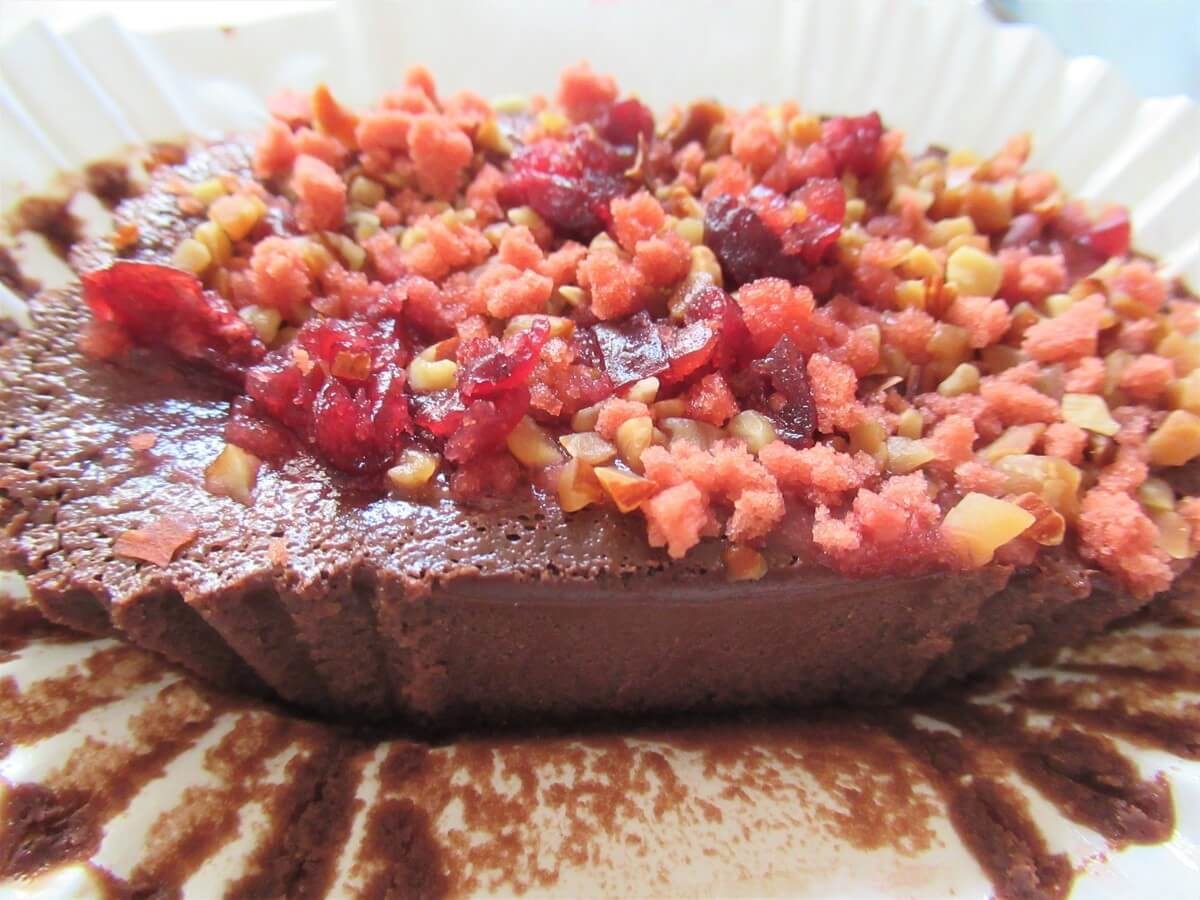 テリーヌショコラの上に、ストロベリー・クランベリー・ラズベリーとナッツ・ベリーソースが乗っています。