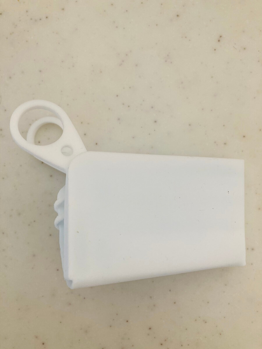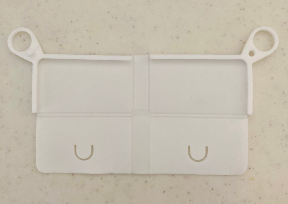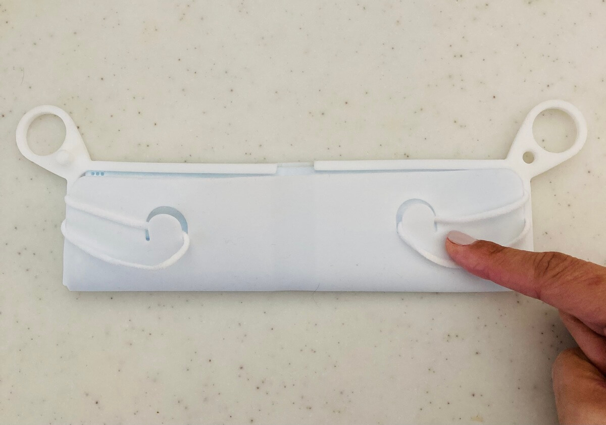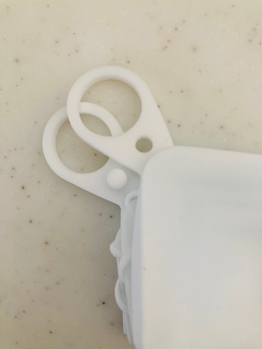 シリコンマスクケースを半分に折りたたみ、ゴム紐をU字の溝に入れ込みます。このとき、折りたたんだ部分を両サイドのコの字型の溝に入れ込んでくださいね。よりきれいに収納できます。