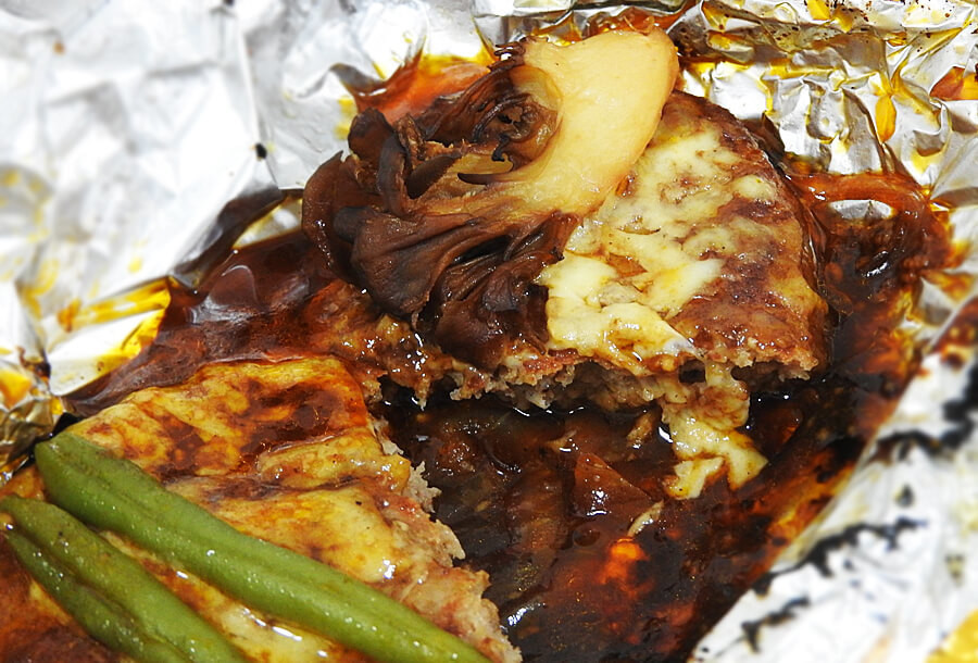 ホイルを開けてみると、肉汁や肉の旨味が濃縮されているであろうデミソース、とろけたチーズが食欲をそそりました。ハンバーグはミニサイズとのことですが、個人的にはそんなに小さいとは思いませんでした。もし、また個人的に注文することがあれば、ミニで十分かな。