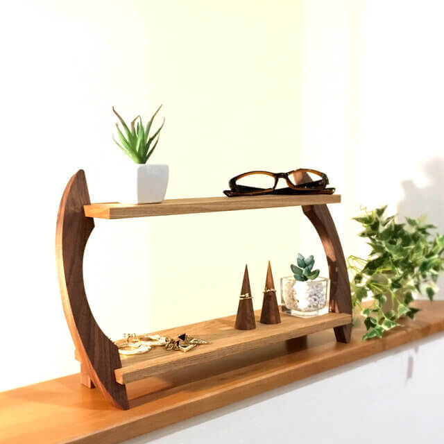 こちらのディスプレイラックは、2種類の木を使用しているのでラック全体のコントラストがとても美しい作品です。玄関やキッチンカウンターなどに置いて、お気に入りの空間を作ってみてくださいね。
