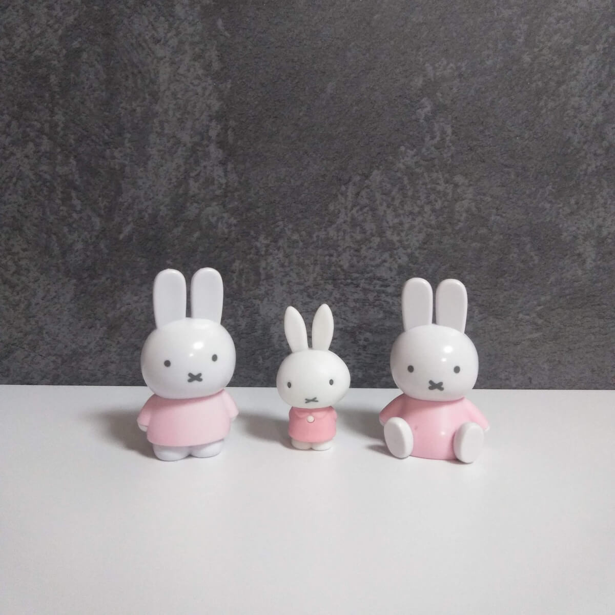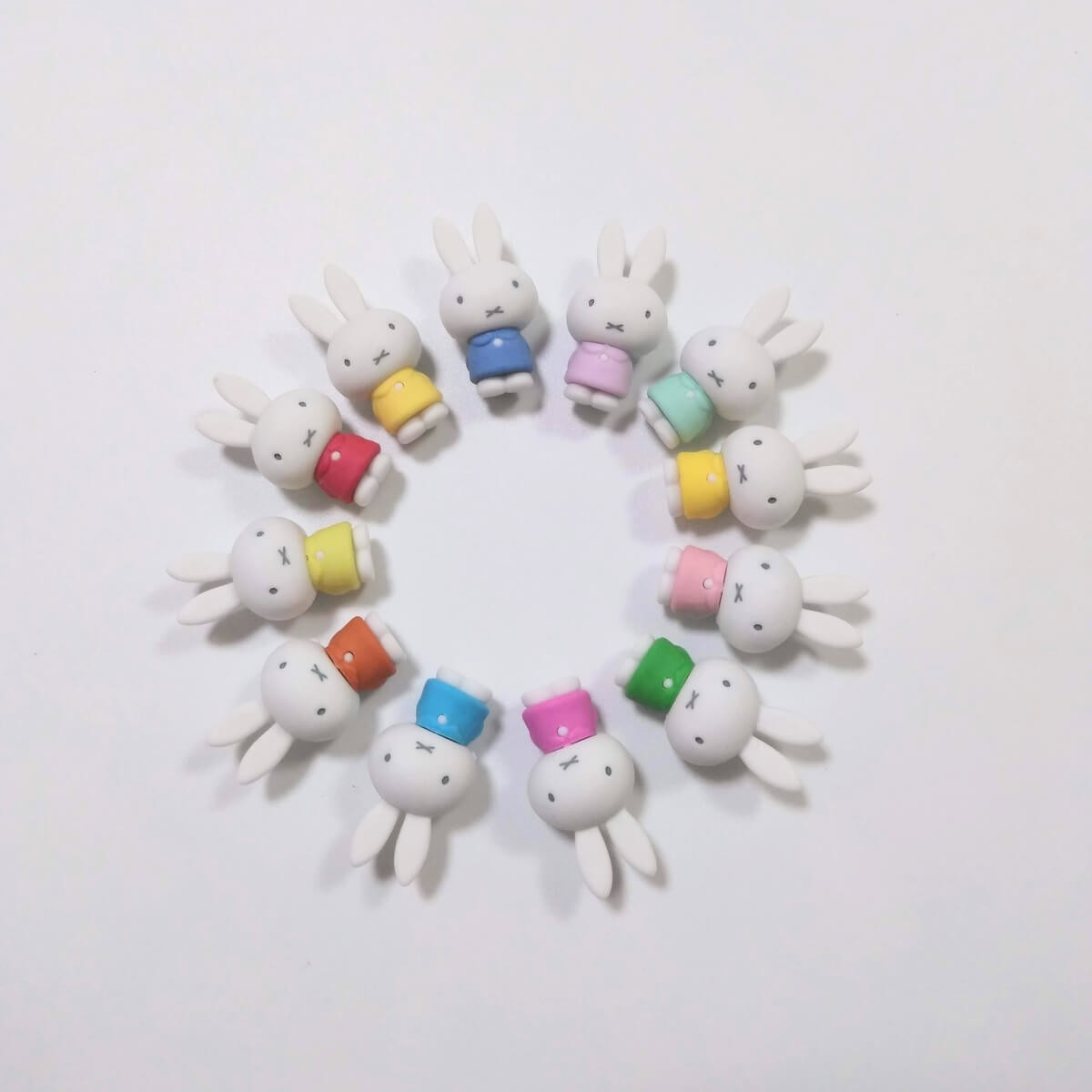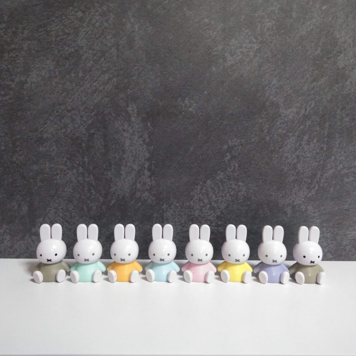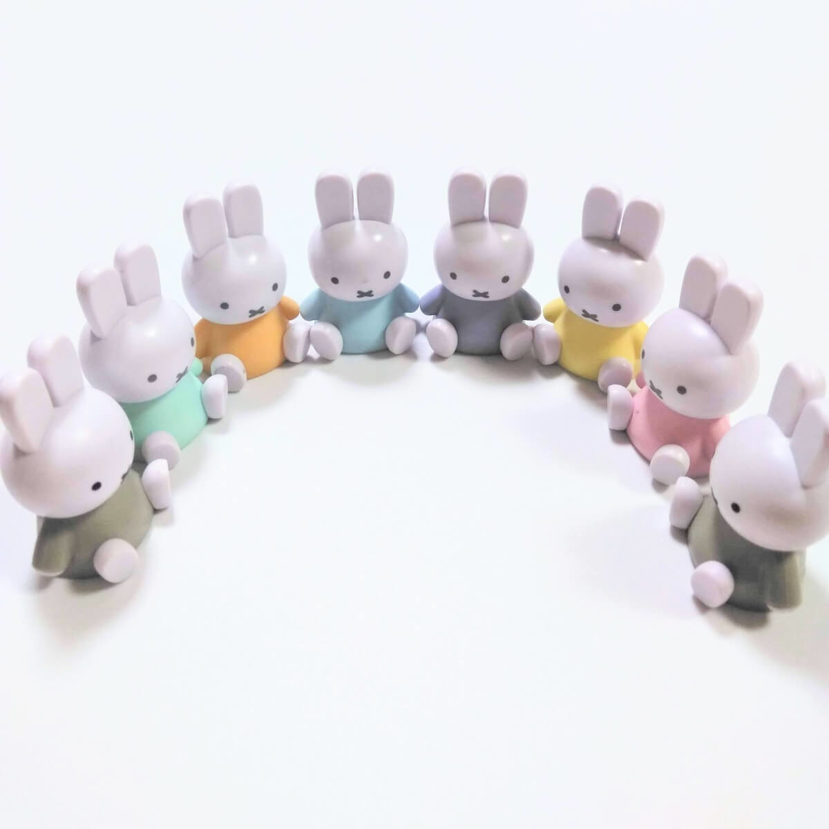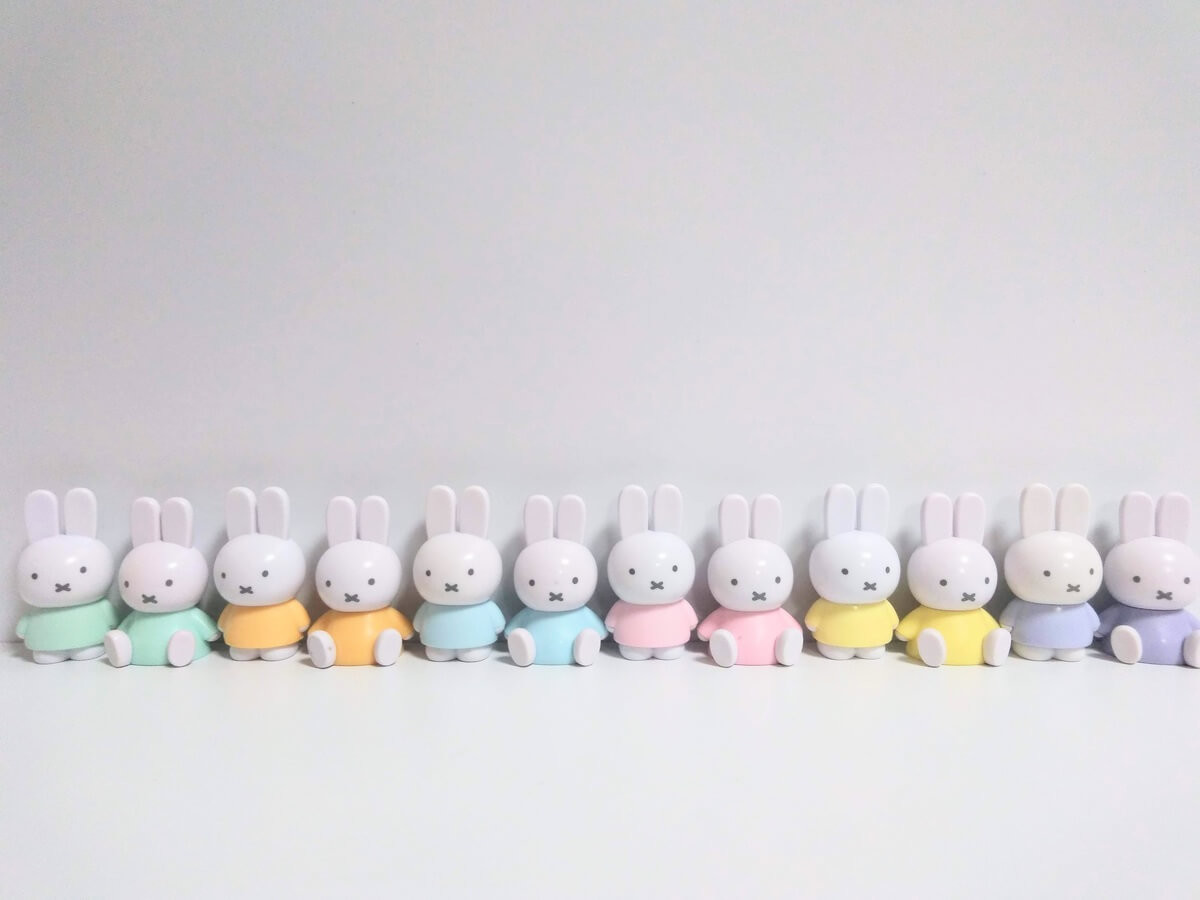 我が家にあるパステルカラーのミッフィーを全部並べてみました。多すぎですね……(汗)。