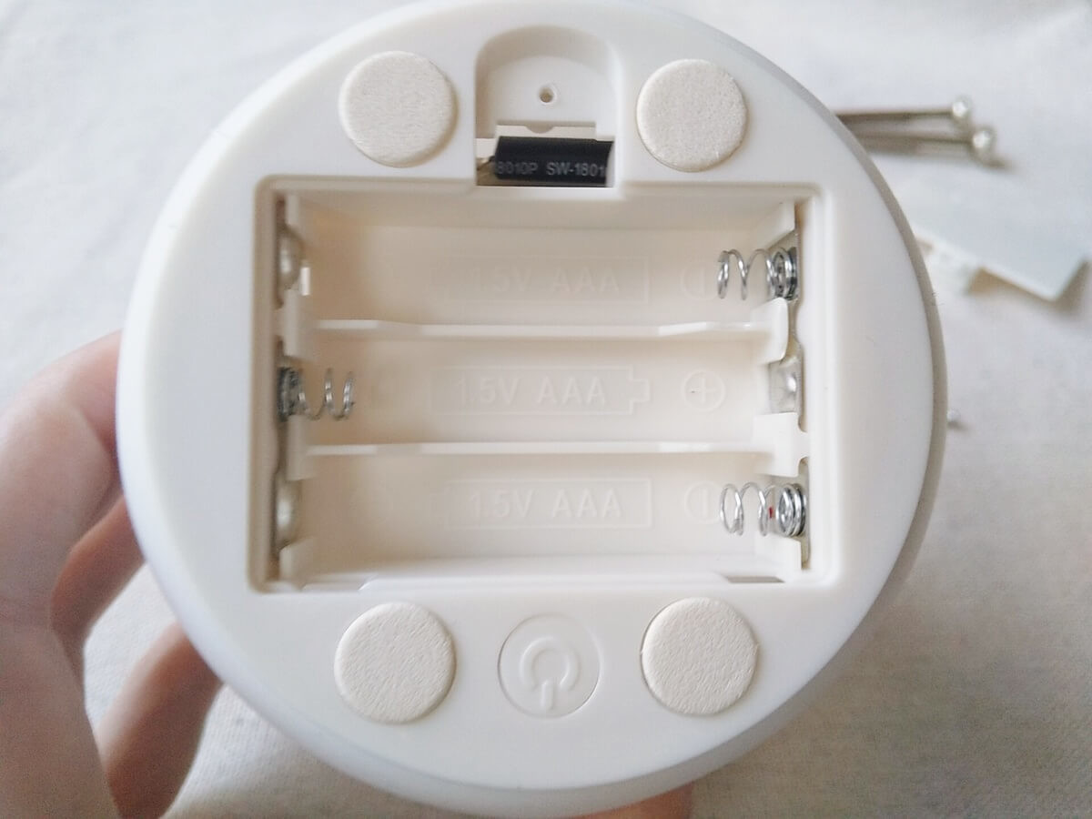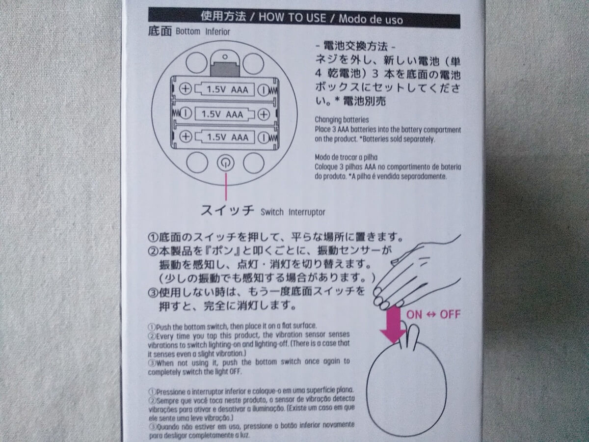 点灯・消灯は「ポンと叩いて」と書かれていますが、トンと横から突っつくだけで大丈夫。振動センサーで作動するので、叩くというより揺らす感じですね。
